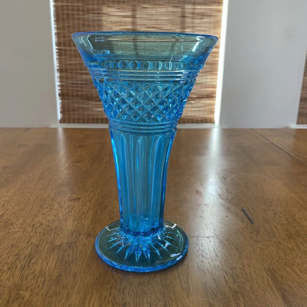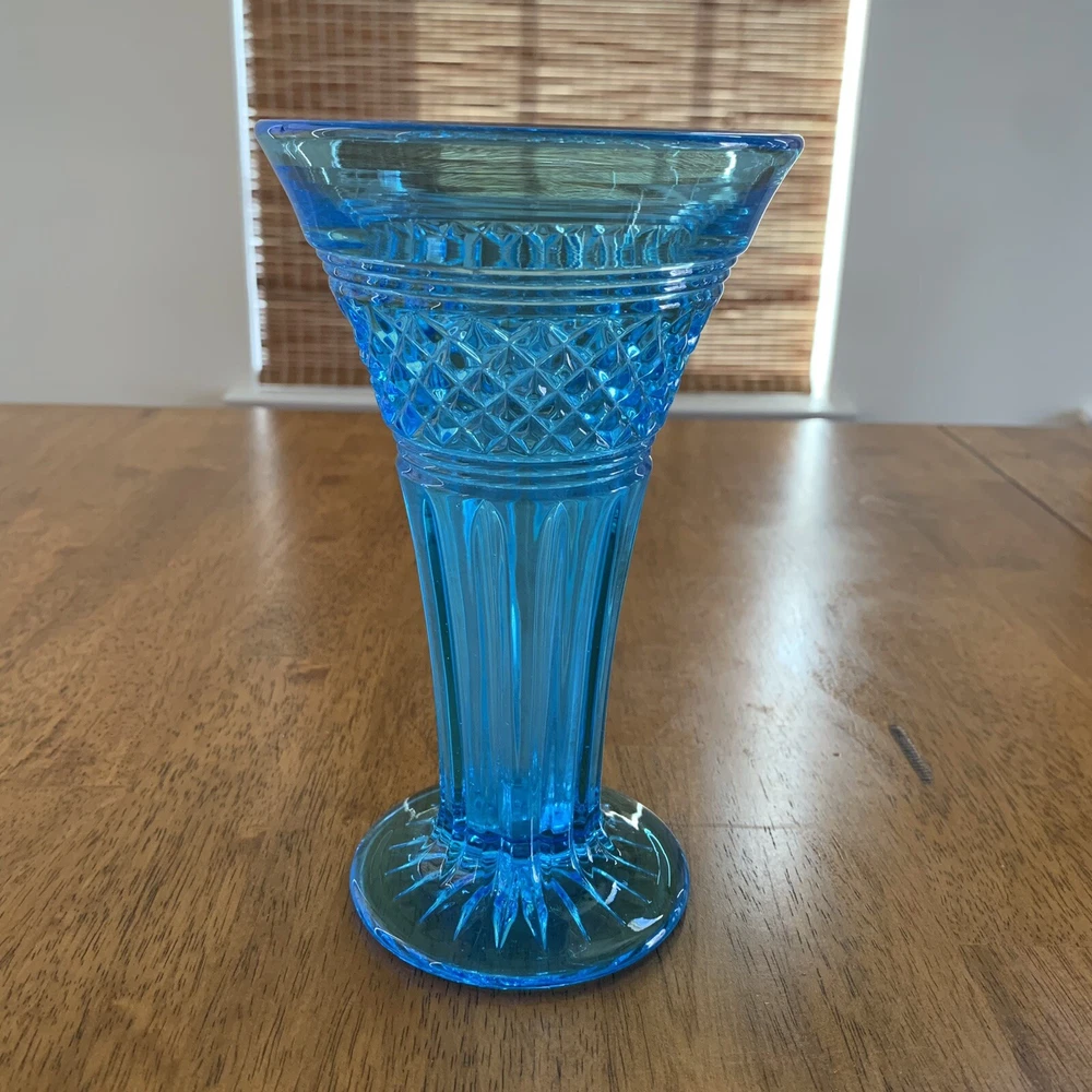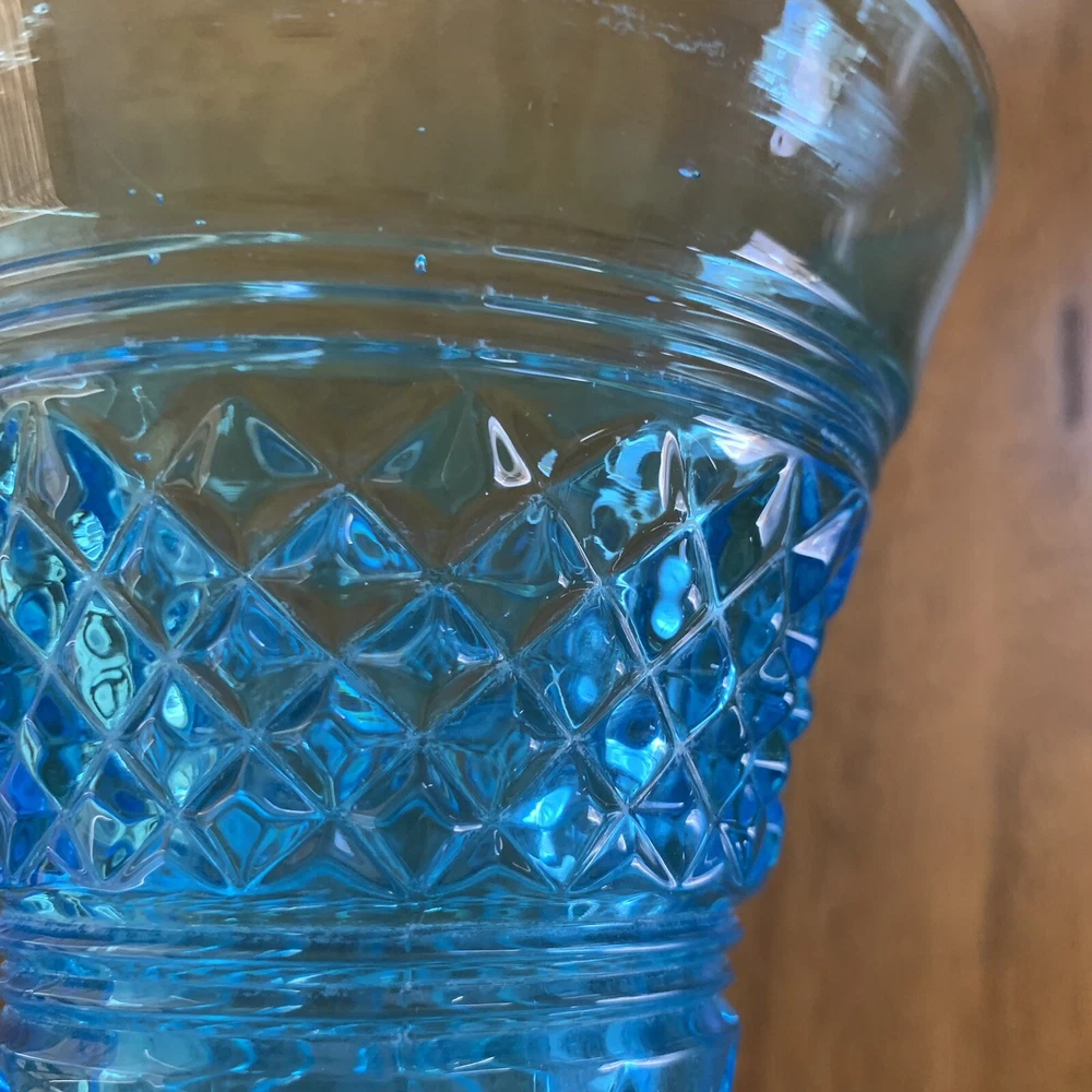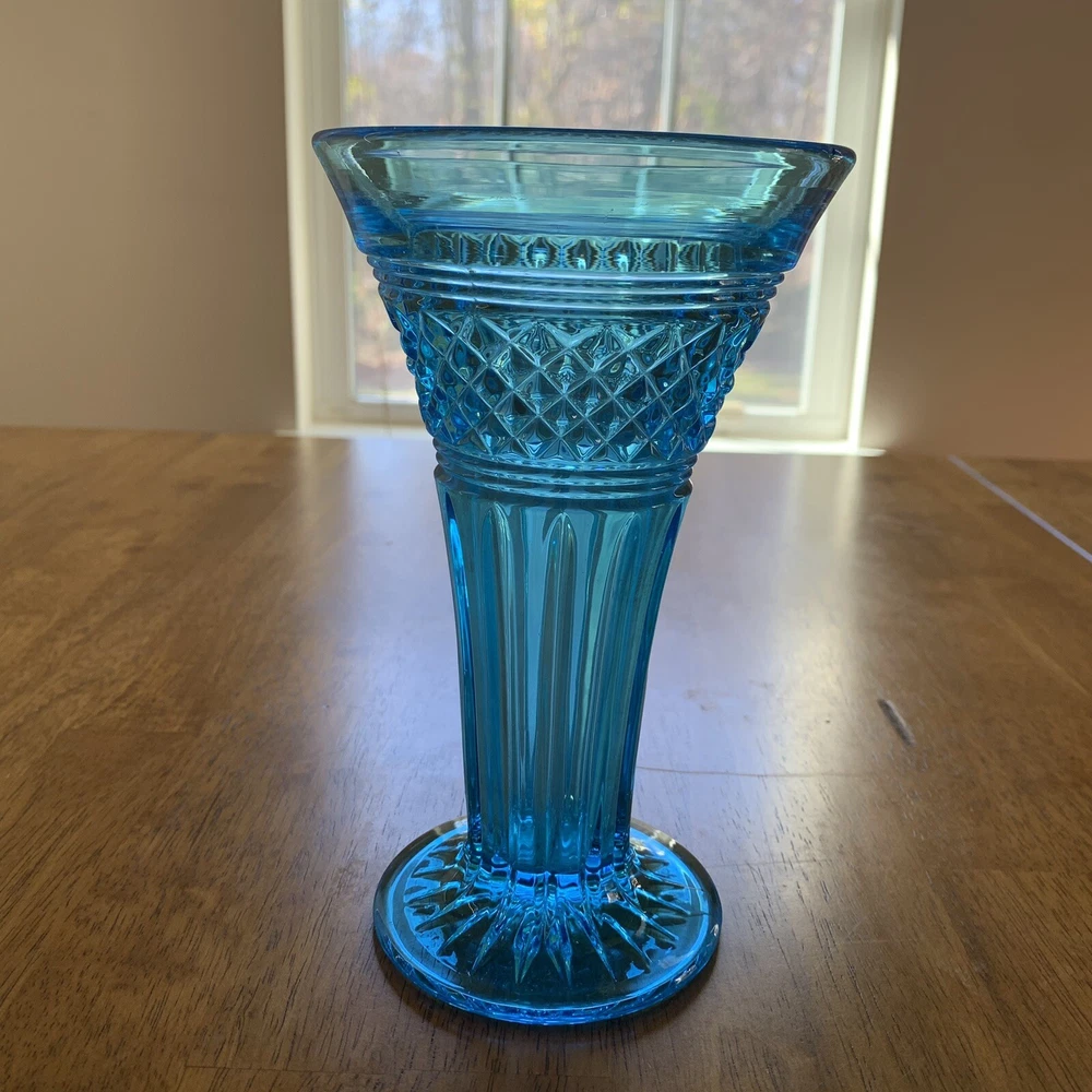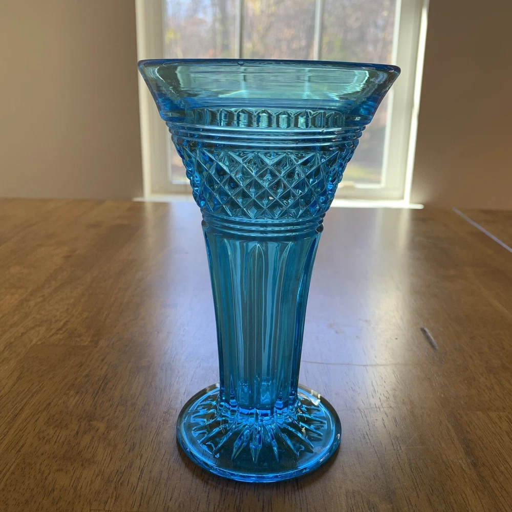 Model: Tiffin-Francisan Baronial Item Height: 7 5/8 inches Origin: United States Country/Region of Manufacture: United States Era: Early 20th Century (1911-1940) Year Manufactured: 1920 Production Style: Art Glass Type: Vase Item Width: 4 1/2 inches Wide At Top Material: Glass Finish: Glossy Antique: Yes Brand: Tiffin-Francisan Pattern: Diamond and Crisscross Item Weight: 1 lb 7.1 ounces Features: Decorative Time Period Manufactured: 1920-1929 Color: Blue