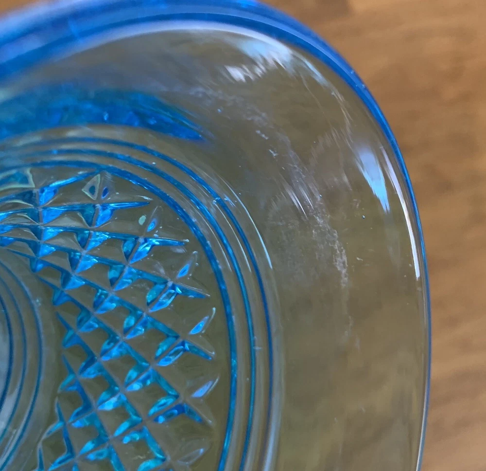Gorgeous Tiffin-Francisan Baronial Blue Vase Rare Find 1920s. This is a really pretty blue color. Very small chip on upper outside rim as pointed out in picture number 7. Size of chip is approximately the diameter of tip of pointer. Small amount of wear on inside of upper rim most likely consistent with age. No other chips cracks. Please see photos.