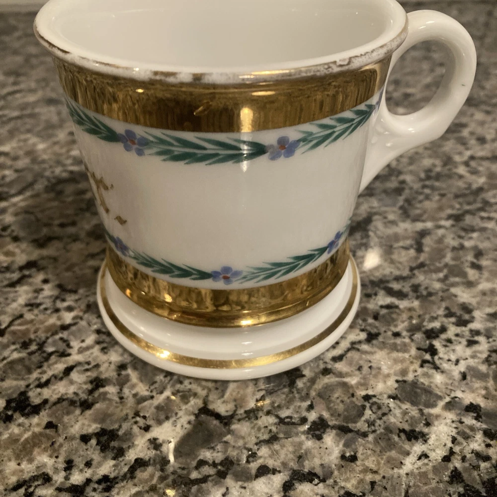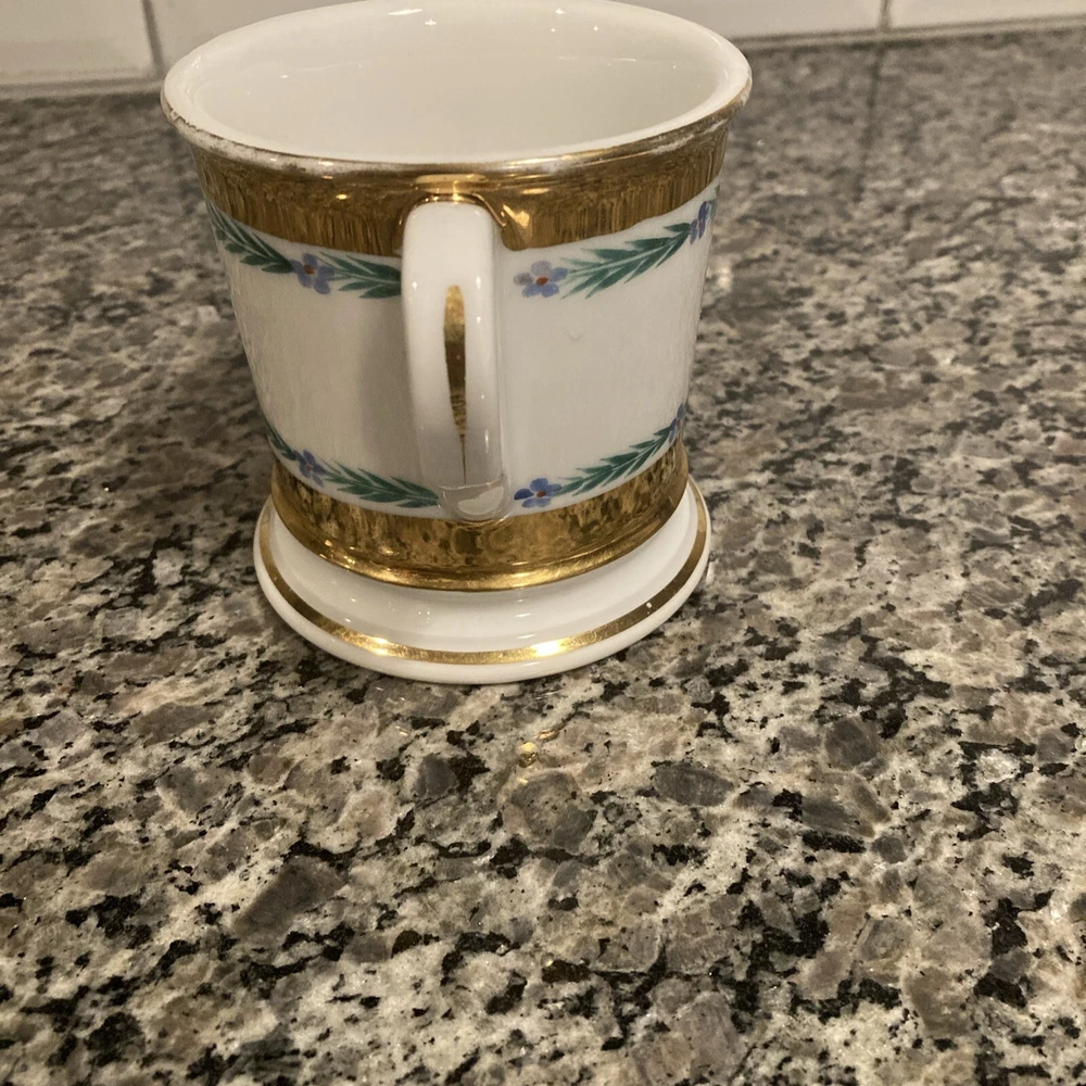 This antique shaving mug is a true gem for collectors. Made by Tressemanes & Vogt, it features a luxurious gold porcelain finish and was crafted in France. The mug is perfect for those who appreciate vintage shaving accessories and want to add a touch of elegance to their collection. It's ideal for use or as a display piece, and would make a great gift for any shaving enthusiast. The mug is categorized under Collectibles, Vanity, Perfume & Shaving, and Shaving, and is sure to be a prized possession for years to come. Add this exquisite piece to your collection today! 4” x 4”