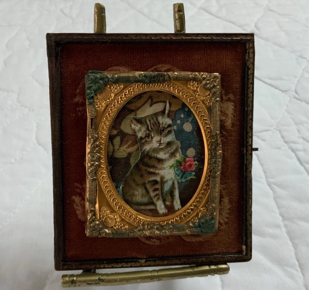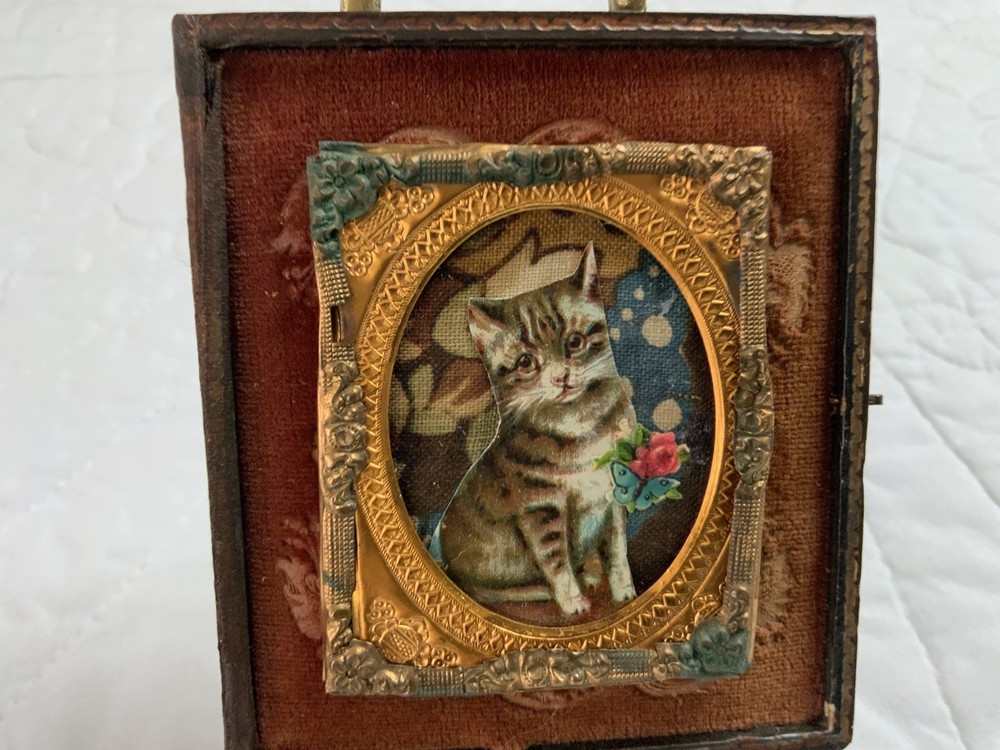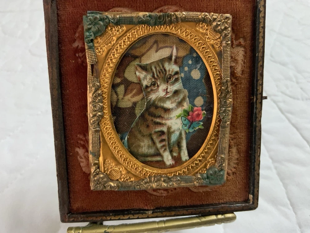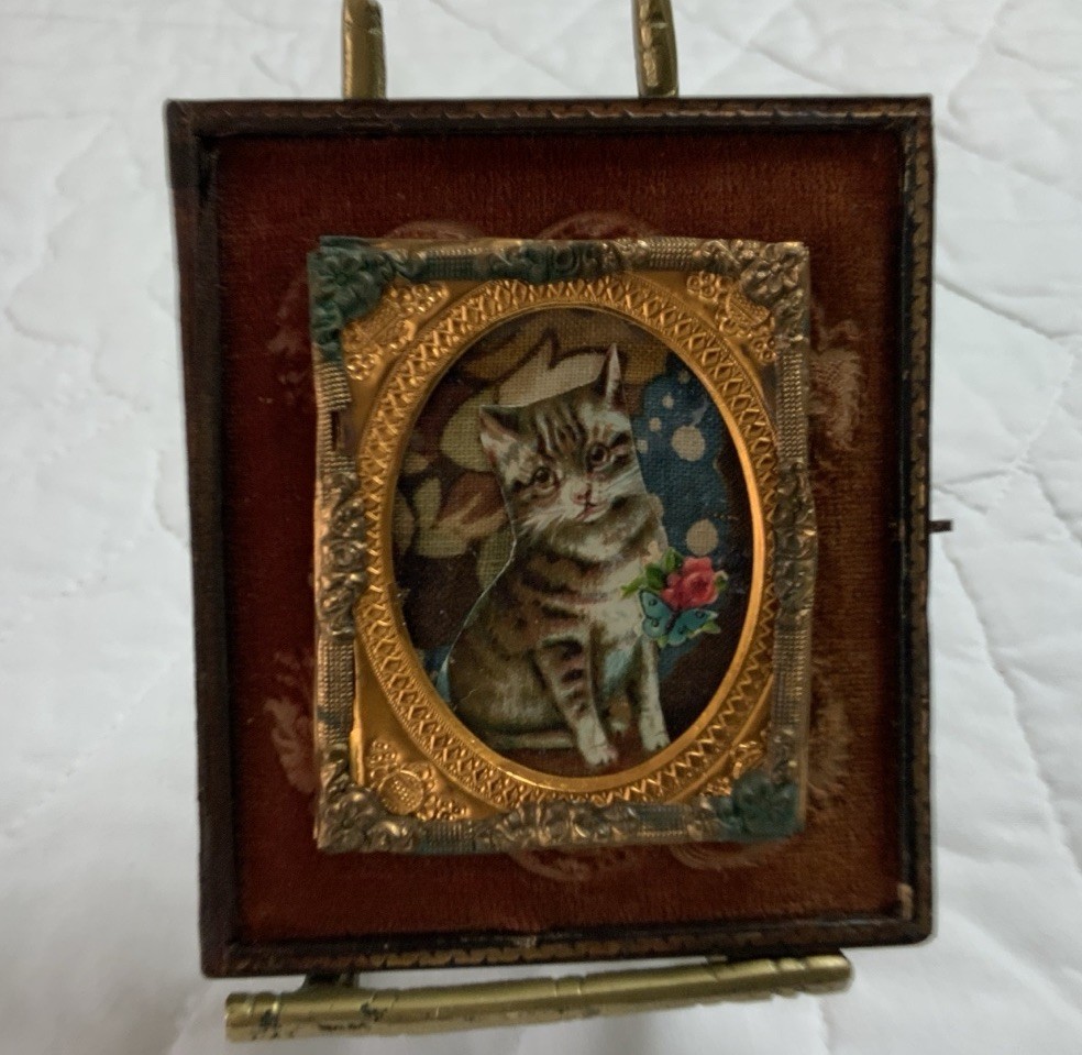 Up for sale is an antique Union case - half case. Inside this small brass mat (gold tone finished with some distressing and damage) is a kitty cat from a Victorian trade card and a flower. Ephemera from the Victorian era. The background is antique fabric, blue, brown and beige. Behind that is the Union case velvet mat, brown. Under glass. Made by me with antique material, antique brass mat from a union case and Victorian trade card. The half union case is on the back with lovely floral and circular design. Super cute with kitty cat. Measures 3 1/4” by 3 3/4” by 1/4”. Super cute. Thanks and happy shopping. I will combine shipping. Please visit my ebay store: webbsamericancounry1 for over 2000 vintage and collectible items.