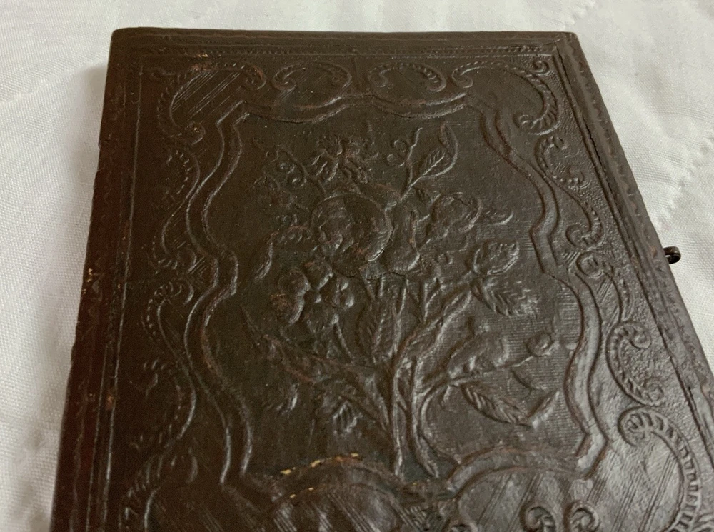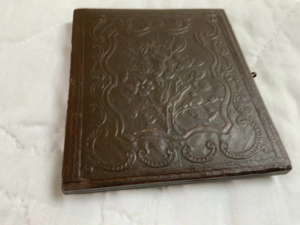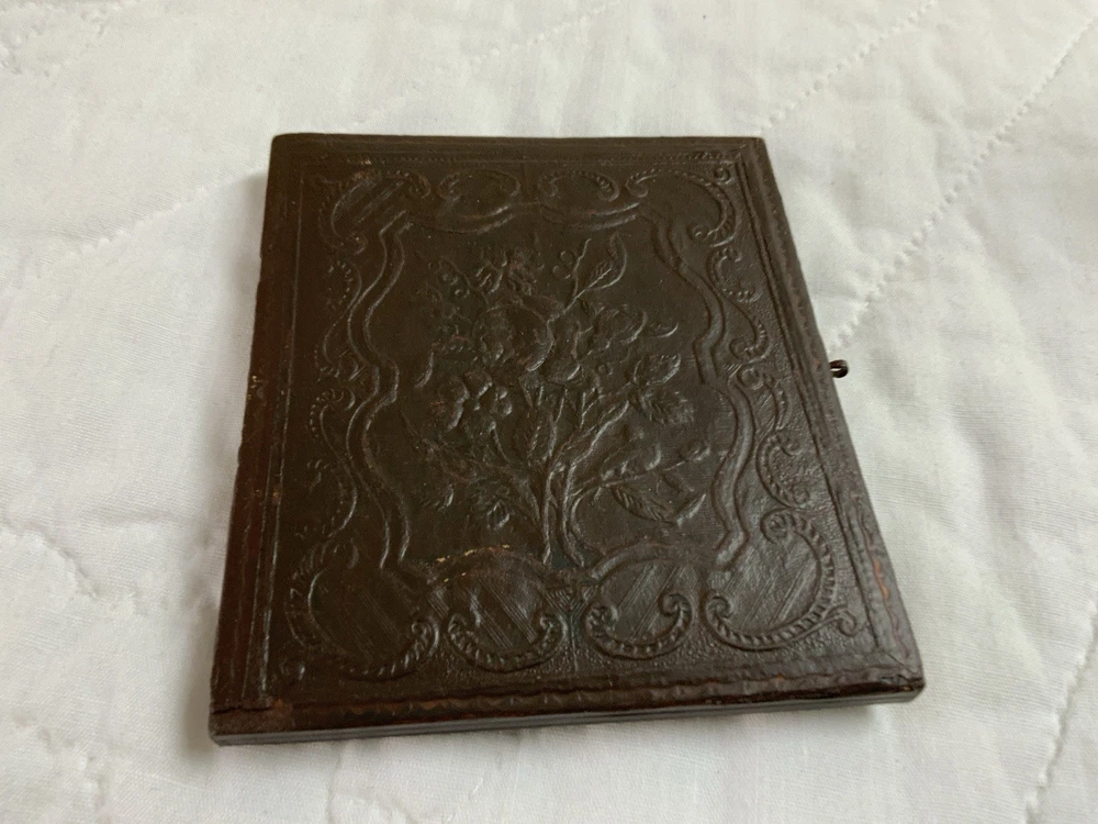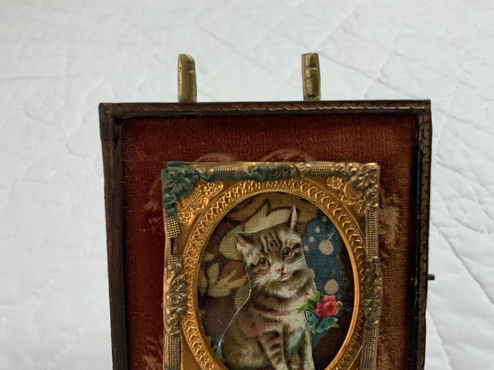 Up for sale is an antique Union case - half case. Inside this small brass mat (gold tone finished with some distressing and damage) is a kitty cat from a Victorian trade card and a flower. Ephemera from the Victorian era. The background is antique fabric, blue, brown and beige. Behind that is the Union case velvet mat, brown. Under glass. Made by me with antique material, antique brass mat from a union case and Victorian trade card. The half union case is on the back with lovely floral and circular design. Super cute with kitty cat. Measures 3 1/4” by 3 3/4” by 1/4”. Super cute. Thanks and happy shopping. I will combine shipping. Please visit my ebay store: webbsamericancounry1 for over 2000 vintage and collectible items.