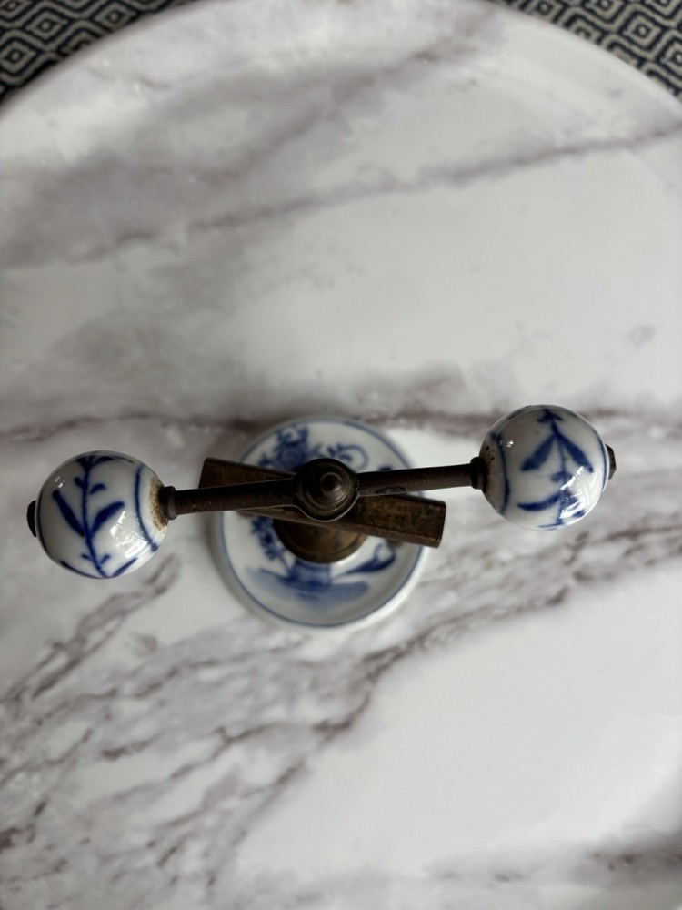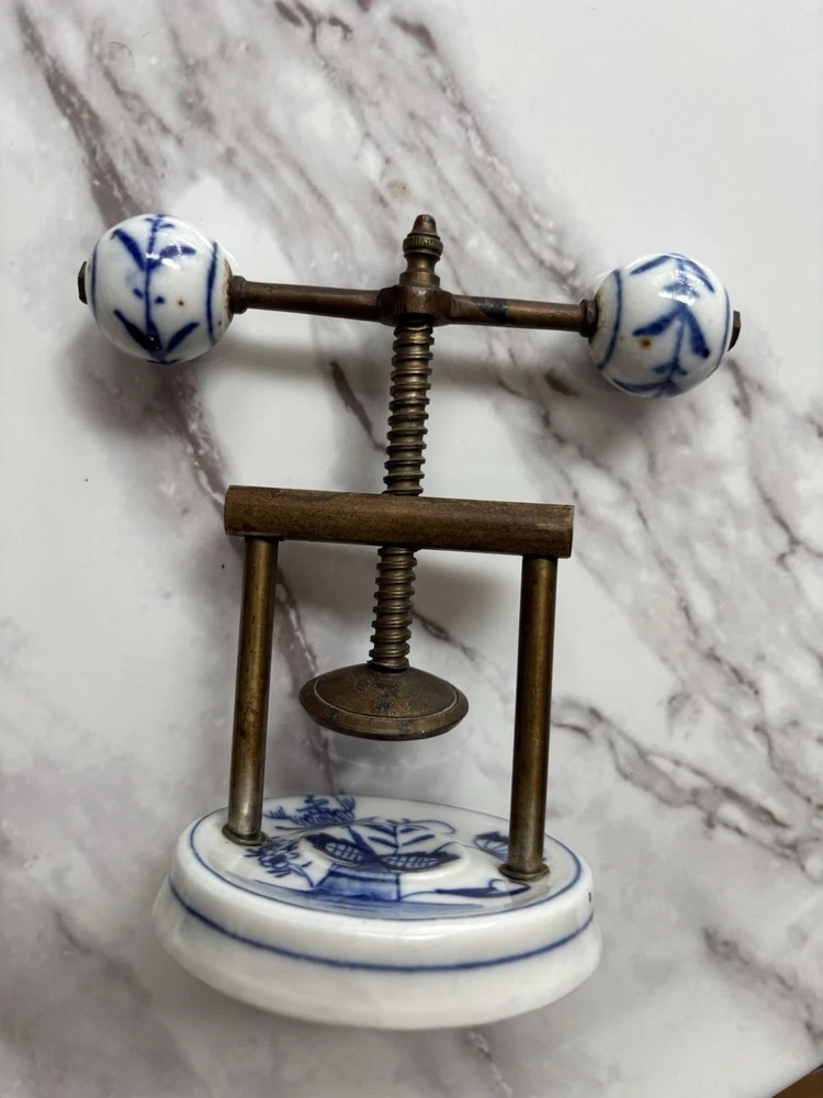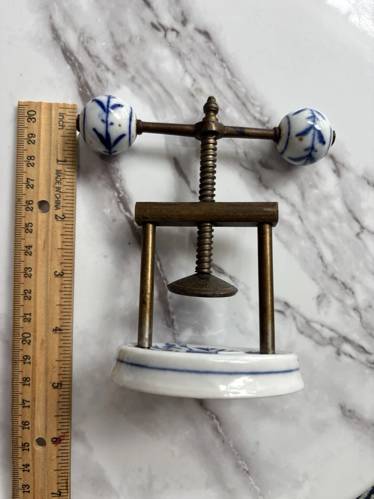 This Antique Victorian Nut Cracker from the 1800s is a unique and charming collectible item and still functions. Made of porcelain and metal, this blue and white nutcracker measures 5 inches in height. With its Victorian style and original design, this piece is sure to add a touch of vintage elegance to any decor. This nutcracker is a special find for collectors of rare and historic items.