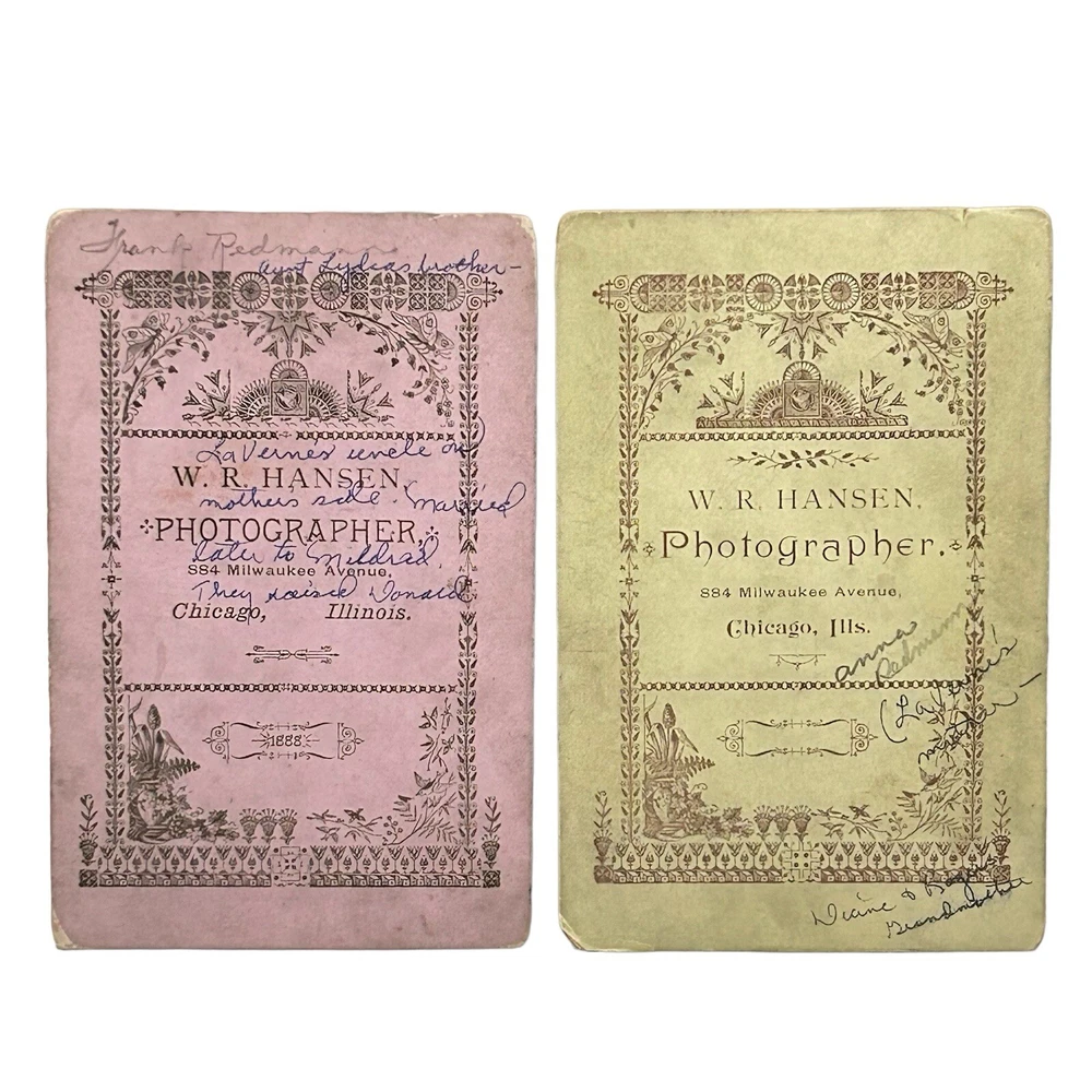 Antique Victorian Cabinet Card Photo Portrait Two Babies Children 1880s Chicago TWO ITEMS Two lovely cabinet cards of children made at the studio of Warren R. Hansen in Chicago and seems to be dated 1888. Looks like relatives were writing on the back to identify. “Do not Copy” stamp not on photos. Items sold as is. Please see all images for further details. Be sure to see all our other items for possible bundle and shopping deals! Will pack with extra care and attention that ephemera items require. Quick shipping guaranteed. Returns accepted at buyer’s expense. Display boxes and props not included unless otherwise noted. Own this lovely pair! We are a reputable seller! Check out our reviews to see what customers say about our products and service. You won’t regret trusting Fairfield for your online purchase.