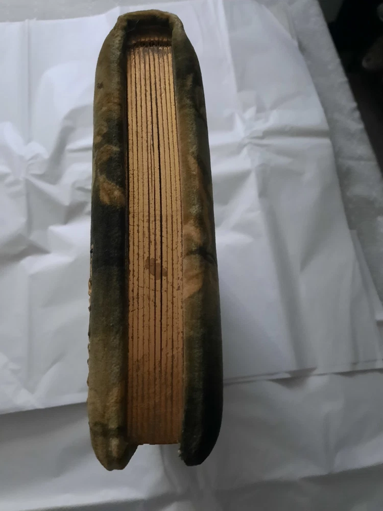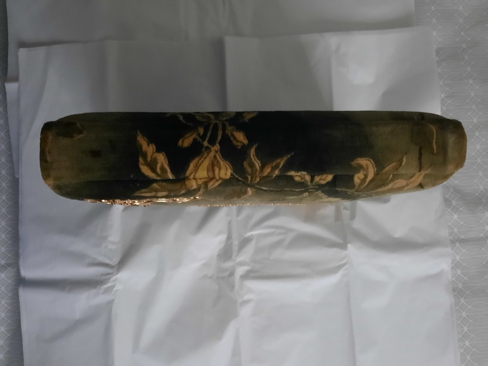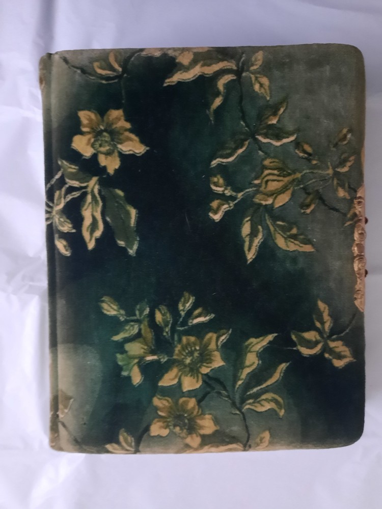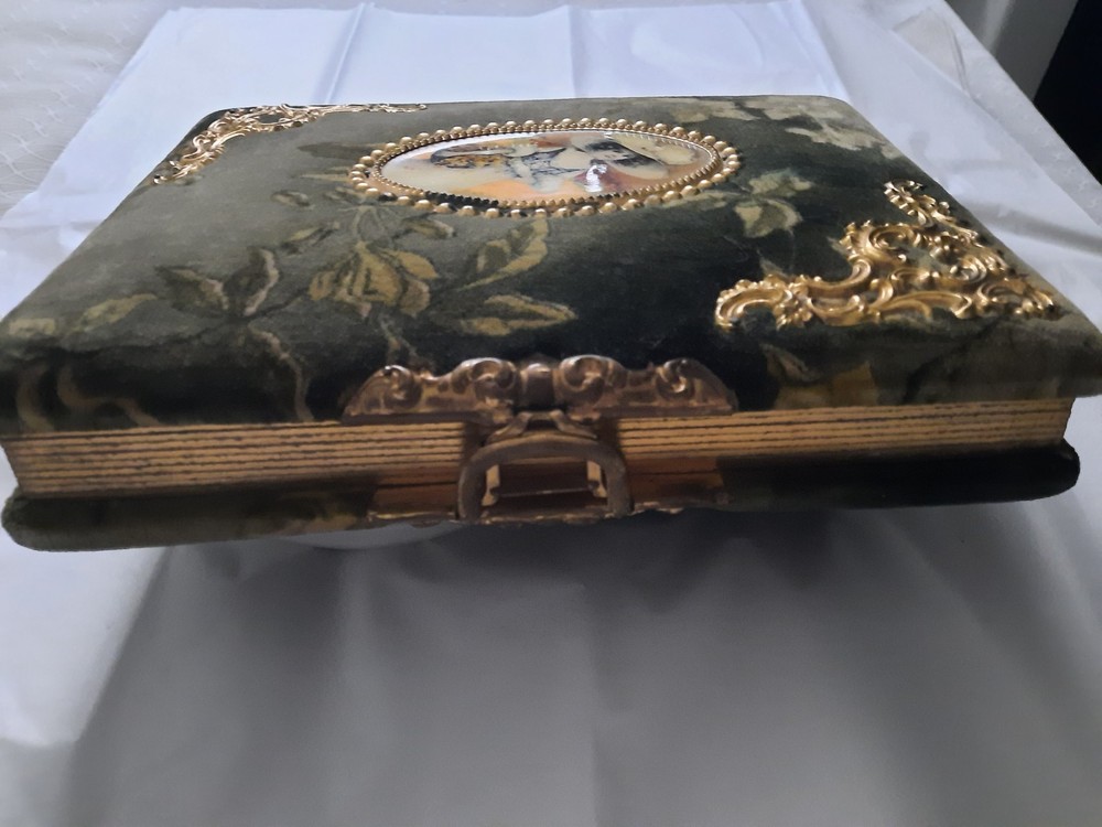 Stunning antique victorian celluloid velvet photo album in excellent vintage condition. This photo album is gorgeous externally displaying a well preserved celluloid cover with a beautiful picture of a woman holding a flower basket, wearing a stylish hat with a large fluffy bow on top. The velvet has a very ornate floral pattern in beautiful plush green colors. The velvet has little to no signs of wear, fading or tears. The golden clasp has no damage and works perfectly. The inside pages are also in excellent condition for the age of the photo album. As shown in the pictures there is some fading and toning to the pages. Measurements approximately 10 1/2" x 9" x 2". 'Check out my other listing for a similar item'