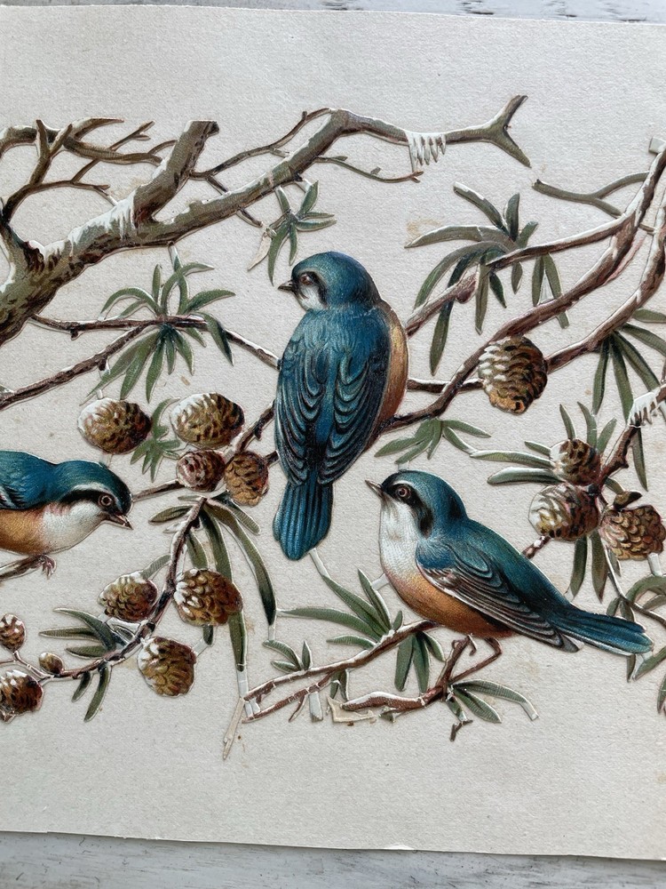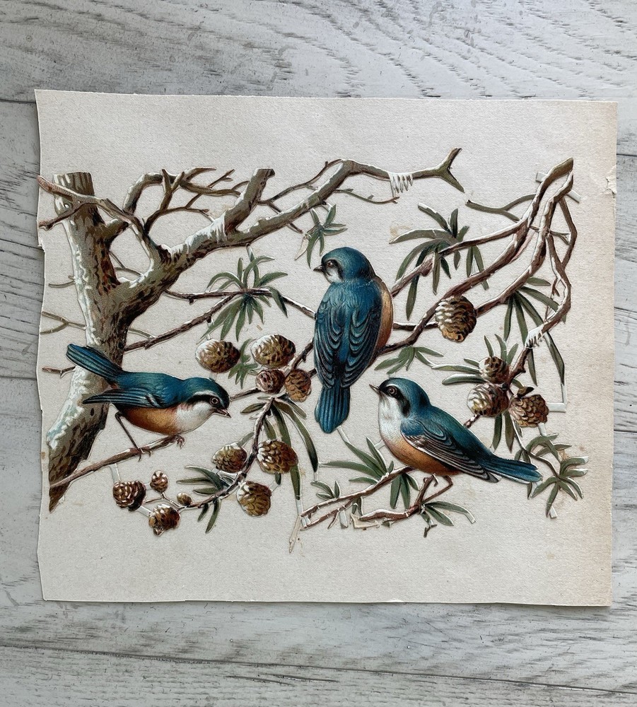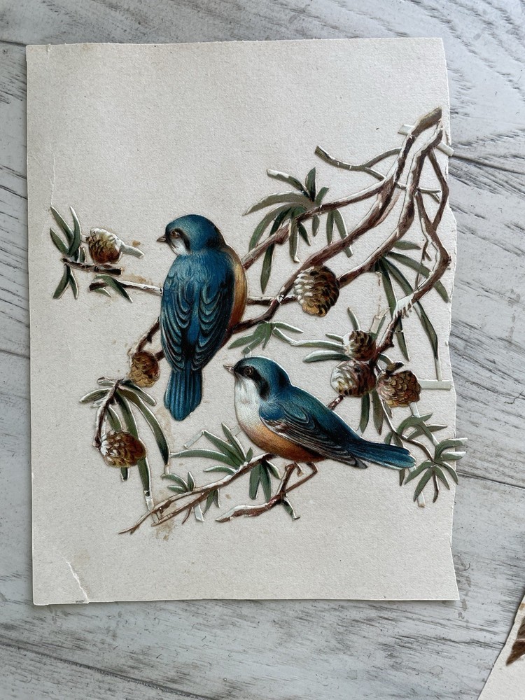 Antique Victorian Die Cut Scrap Birds Titmouse In Branches, large is 7 by 5 inches, smaller is 5 by 5.