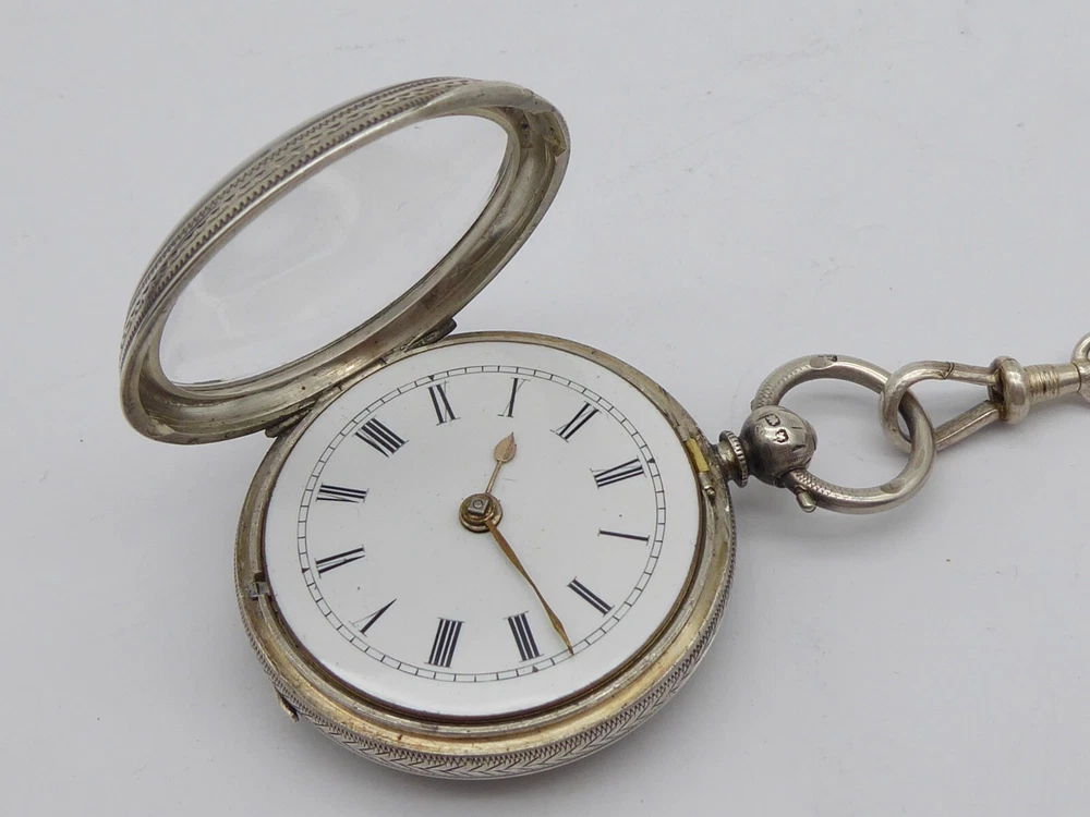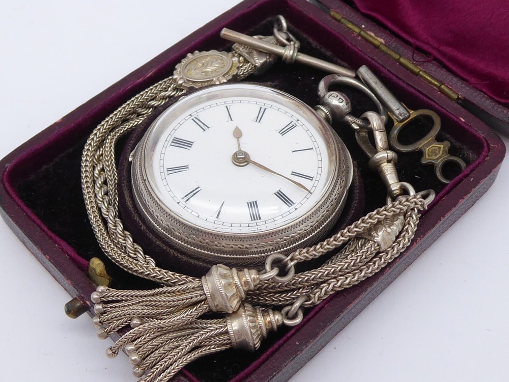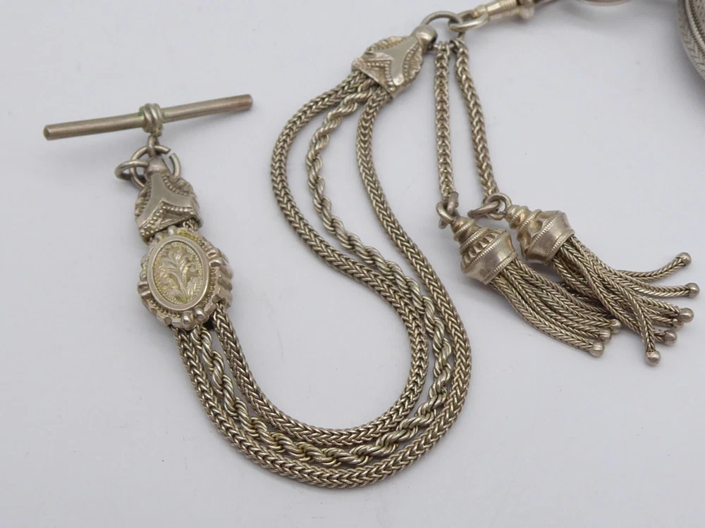 Offered for auction is a superb antique Victorian ladies solid sterling silver fob / pocket watch with Albertina in box. The watch is hallmarked for Birmingham 1896 by William Ehrhardt. A Fine quality example with beautiful engraved decoration to the case. The Albertina is unmarked but tested as silver and has two tassel fobs attatched. The watch comes with key. The watch measures approx. 41 mm wide. The Albertina is approx. 22.5 cm long including tassels Thanks for looking, please check out my other items and add me to your favourite sellers for similar items listed every week Please note all items are listed for auction without reserve and with no buy it now prices