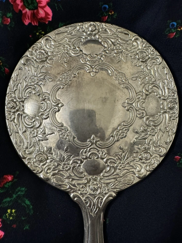 Antique Victorian Silver & Glass Hand Mirror Ornate Repousse Foliate. Good condition. No chips or cracks .