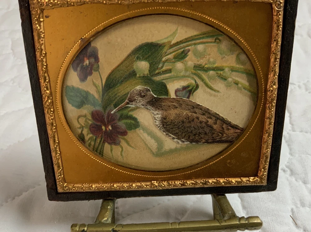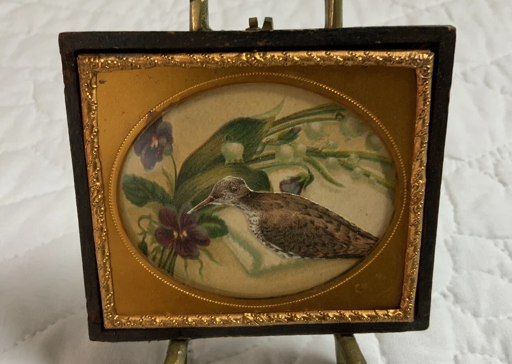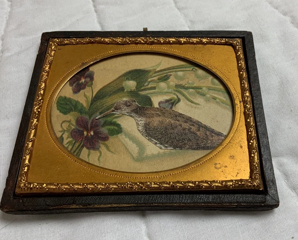 Up for sale is a vintage antique Victorian trade card ephemera framed. Half antique union case. Blackish brown. The Victorian ephemera trade card design is a flowers, leaves, bird. (Cut to size). The colors are off white, green, white, violet, brown, beige, multi. Original Victorian art. This has been put together by me. The union case and the Victorian trade card are antique/vintage. Gold detailed frame and mat around the die cut. Under glass. This union case finish is a blackish brown and has been touched up by me. Measures 3 5/8โ by 3 1/4โ by 1/4โ. Very, very good condition. ๐ผ๐ฆ๐บ Thanks and happy shopping. I will combine shipping. Payment due within three days. Please visit my ebay store: webbsamericancounry1 for over 2000 vintage and collectible items.