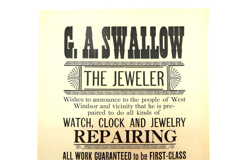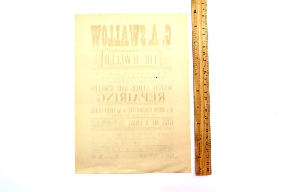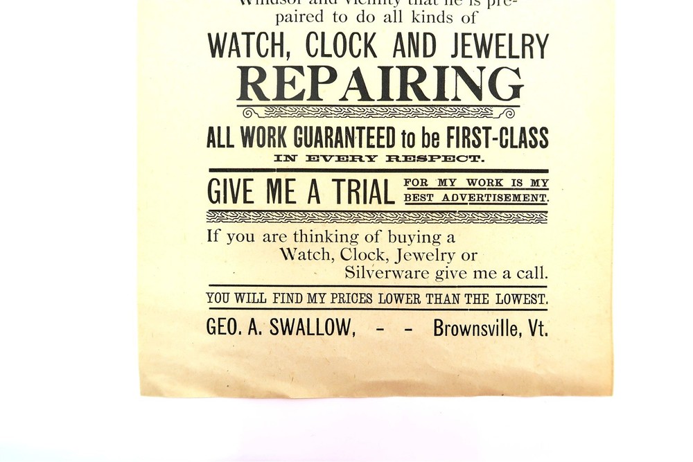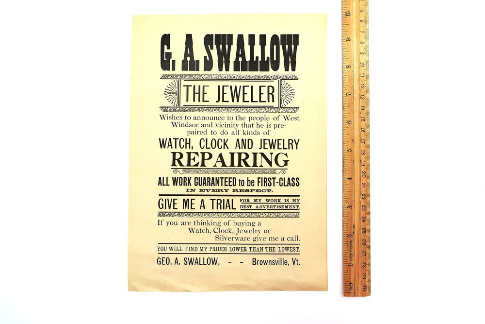 Antique WATCH CLOCK AND JEWELRY REPAIR Advertising Flyer G A Swallow Jeweler n2 This eBay listing is for an antique advertising flyer for G A Swallow Jeweler for Watch, Clock and Jewelry repair located in Brownsville, VT. Age is unknown but it looks to be from the late 1800's. This piece measures 10" x 7" and the condition is excellent for it's age. Seller Location Reference - Toy Rows/Comics Box 22 BID IN CONFIDENCE – CHECK MY FEEDBACK! My goal is your satisfaction. I leave positive feedback right after the payment is received for all orders!! If you plan to leave anything less than positive feedback and 5 stars - please let me know so that I can work out any problems that you may have. I aim to please!! SHIPPING & HANDLING FOR US BIDDERS We ship ASAP upon payment as noted above within 1 business day 99% of the time!! We normally pack up your new treasures 2 - 3 times a day and ship using USPS and Fedex Ground so that you get your items in a timely fashion. As always - there is no charge for local pickup on any of my items!! SHIPPING AND HANDLING FOR INTERNATIONAL BIDDERS Import duties, taxes and charges are not included in the item price or shipping charges. These charges are the buyer’s responsibility. Please check with your country’s customs office to determine what these additional costs will be prior to bidding/buying.” THANK YOU AND HAVE A WONDERFUL DAY!! Powered by SixBit's eCommerce Solution