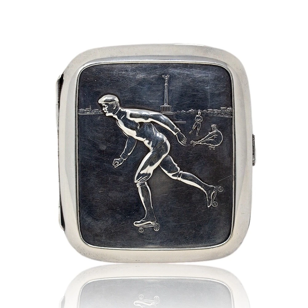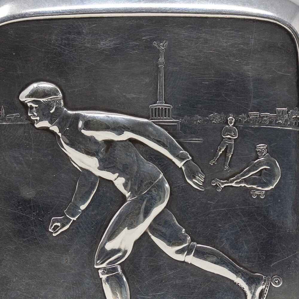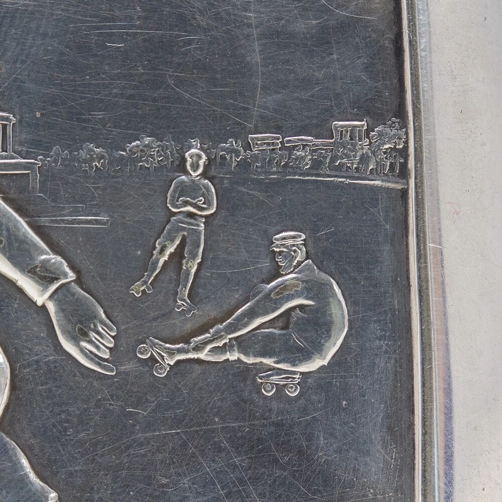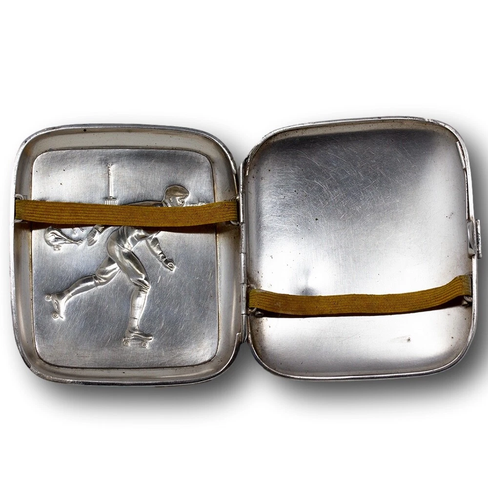 WMF Novelty Cigarette Case Jacksons Antique are pleased to offer this Rare Jugendstil WMF Roller Skating Cigarette Case. The Cigarette Case of slim rectangular form plated in Silver features a central front scene with three male figures roller skating in a city square. The males in period attire with four wheeled skates performing different poses infront of the the Victory Column in Berlin, Germany. The case opens to reveal the original elasticated ribbons for holding cigarettes and is fully hallmarked to the base of the exterior. The hallmarks read N for Neusilber (Nickel silver) and serves as a designation of a base metal for silvering, the famous WMF Ostrich mark within a square used between 1903 to 1910, I/O which refers to the normal thickness of silver deposited onto the surface of the base metal and OX for oxydiert in German or oxidised in English which is the artificial darkening of the silver surface to a grey colour. FREE WORLD WIDE SHIPPING ON THIS ITEM Condition Very Good antique condition, no restoration Please be aware all the items we sell are not new. They are either vintage or antique meaning they are used and bear qualities of being handled or used for many years. This typically will mean that the objects will have surface marks or wear consistent with long term use. Measurements 9.5cm High x 8.5cm Wide x 2cm Deep (3.74 x 3.35 x 0.8 Inches) Please buy with confidence, we have been in the business for over 10 years and have recently decided to pursue ebay due to the volume of stock we hold. We sell regularly aboard and double box all relevant parcels for safety. We typically ship with Royal Mail or UPS. Trade Enquiries Welcome ! Please see our other items for weekly buy it now and auction listings. Please sign up to our ebay and own newsletters for updates!
