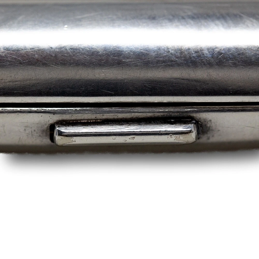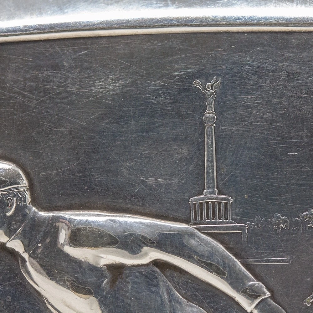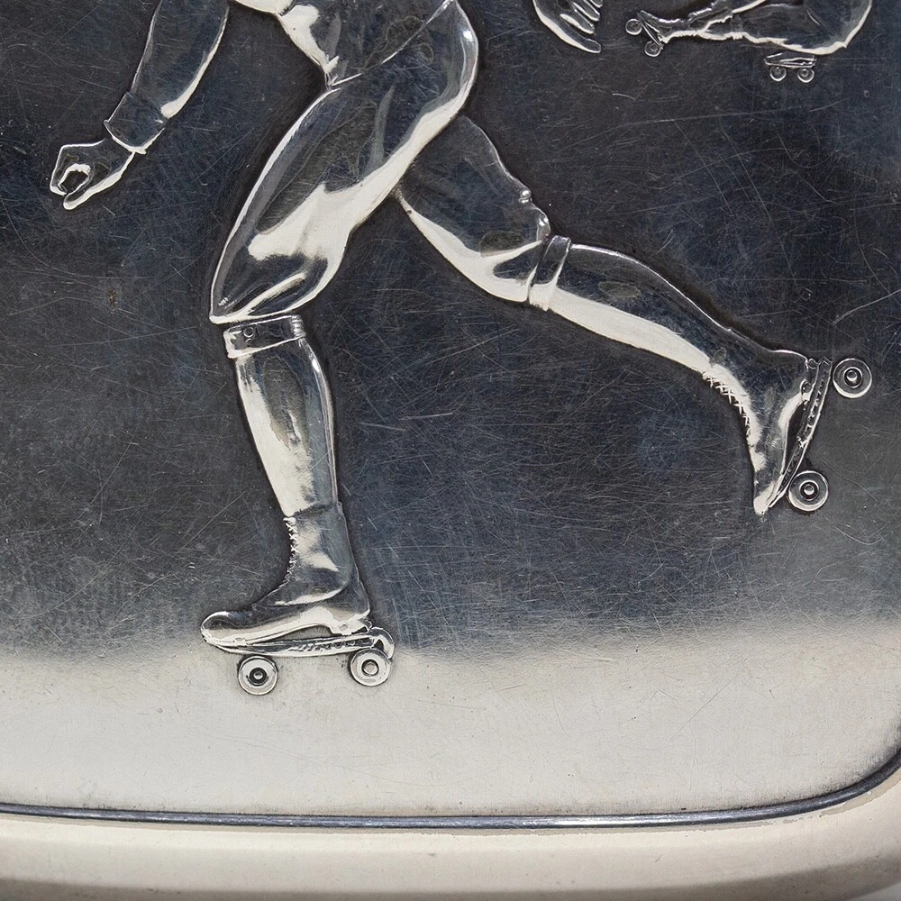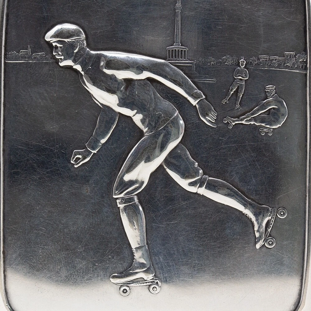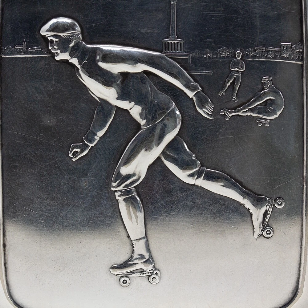 WMF Novelty Cigarette Case Jacksons Antique are pleased to offer this Rare Jugendstil WMF Roller Skating Cigarette Case. The Cigarette Case of slim rectangular form plated in Silver features a central front scene with three male figures roller skating in a city square. The males in period attire with four wheeled skates performing different poses infront of the the Victory Column in Berlin, Germany. The case opens to reveal the original elasticated ribbons for holding cigarettes and is fully hallmarked to the base of the exterior. The hallmarks read N for Neusilber (Nickel silver) and serves as a designation of a base metal for silvering, the famous WMF Ostrich mark within a square used between 1903 to 1910, I/O which refers to the normal thickness of silver deposited onto the surface of the base metal and OX for oxydiert in German or oxidised in English which is the artificial darkening of the silver surface to a grey colour. FREE WORLD WIDE SHIPPING ON THIS ITEM Condition Very Good antique condition, no restoration Please be aware all the items we sell are not new. They are either vintage or antique meaning they are used and bear qualities of being handled or used for many years. This typically will mean that the objects will have surface marks or wear consistent with long term use. Measurements 9.5cm High x 8.5cm Wide x 2cm Deep (3.74 x 3.35 x 0.8 Inches) Please buy with confidence, we have been in the business for over 10 years and have recently decided to pursue ebay due to the volume of stock we hold. We sell regularly aboard and double box all relevant parcels for safety. We typically ship with Royal Mail or UPS. Trade Enquiries Welcome ! Please see our other items for weekly buy it now and auction listings. Please sign up to our ebay and own newsletters for updates!
