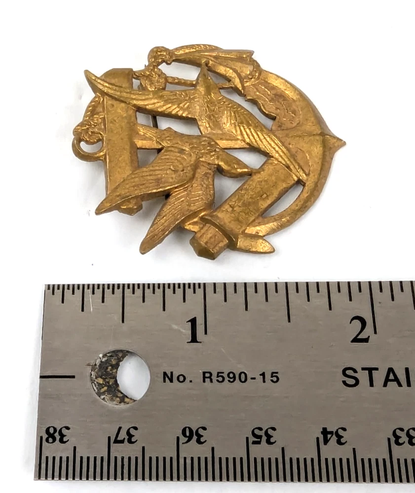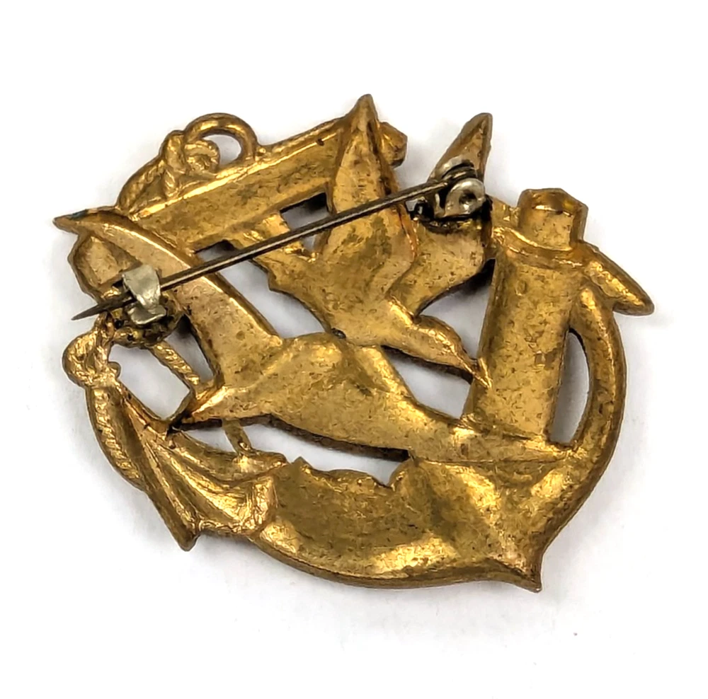 Antique World War II Era Navy Brooch Pin Cap Badge. Features two Swallows and Anchor. Measures 1 7/8" by 1 3/4" Closes with a C clasp. 5105