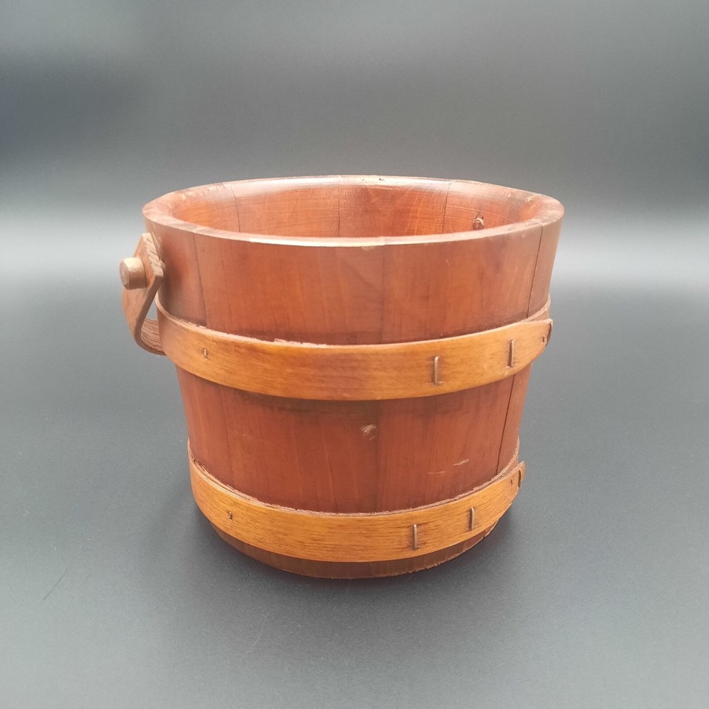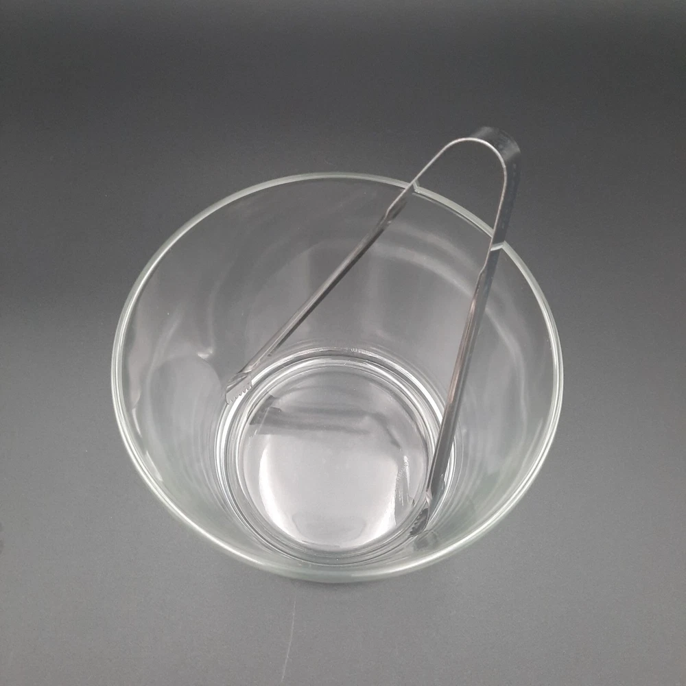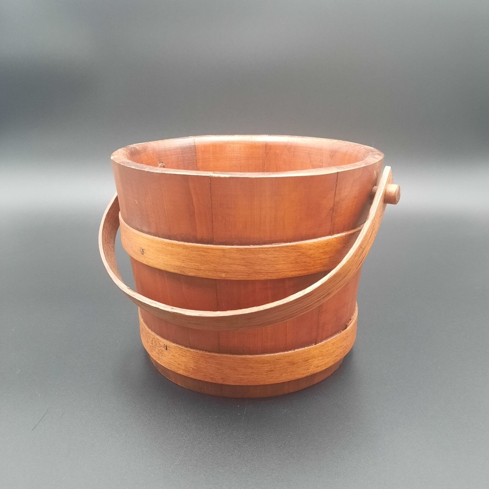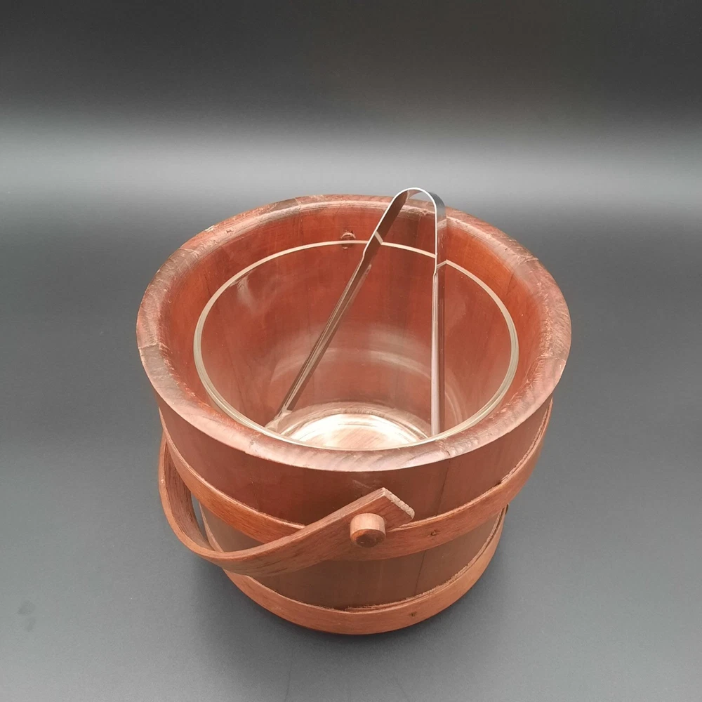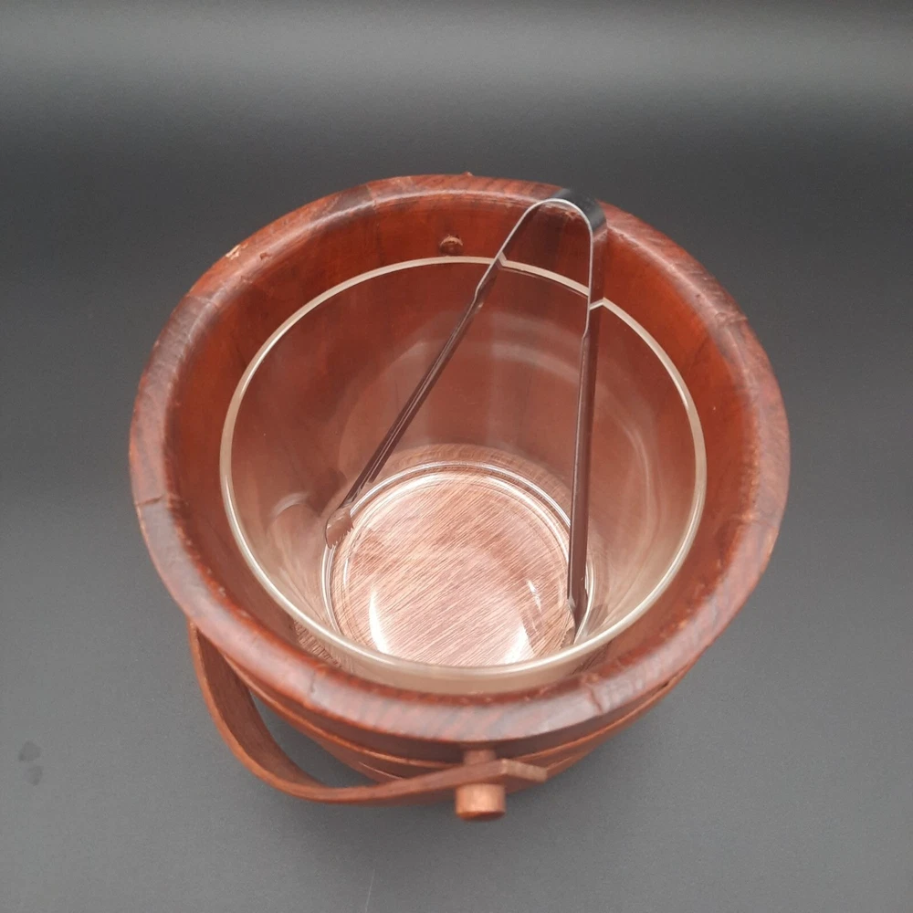 This vintage wood and glass ice bucket offers both functionality and classic design. The glass insert ensures easy cleaning, and the wooden exterior adds a touch of rustic charm. Ideal for entertaining, this bucket includes a pair of tongs for convenient ice serving. • Glass insert for easy cleaning • Includes metal tongs • Sturdy wood handle • Rustic wooden exterior • Compact design Approx. Top to bottom = 6 inches Approx. Diameter = 7.5 inches