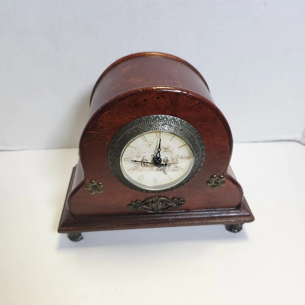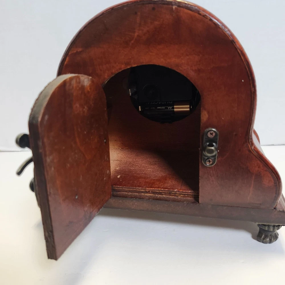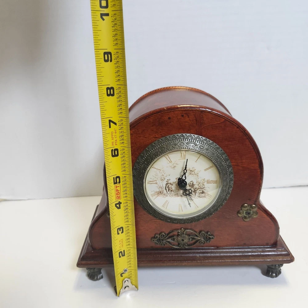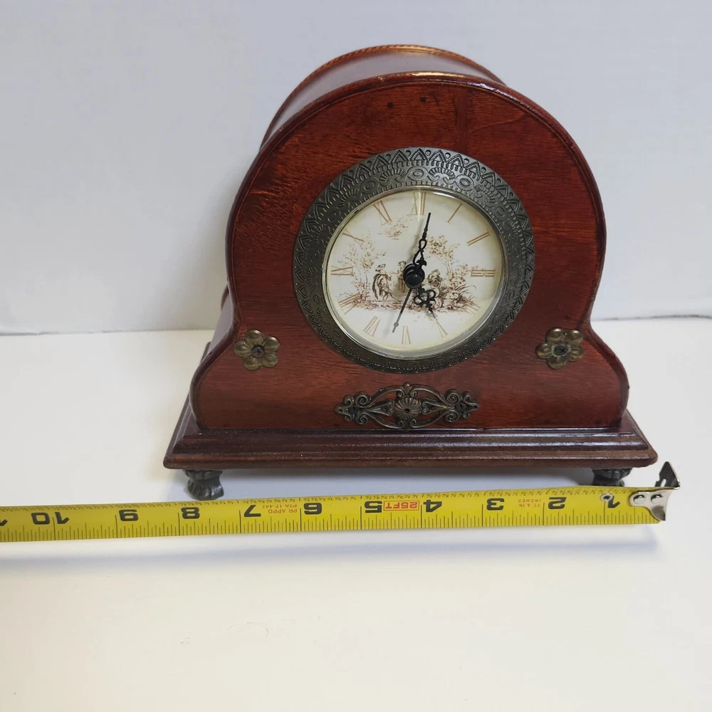 Elegant antique wooden mantel clock featuring brass accents and Roman numerals. A charming addition to any home decor, combining functionality and classic style. • Wooden construction • Brass accents • Roman numeral clock face • Decorative front and back • Height: 8 inches • Width: 8.5 inches Minor scratches on wood, latch on back door.