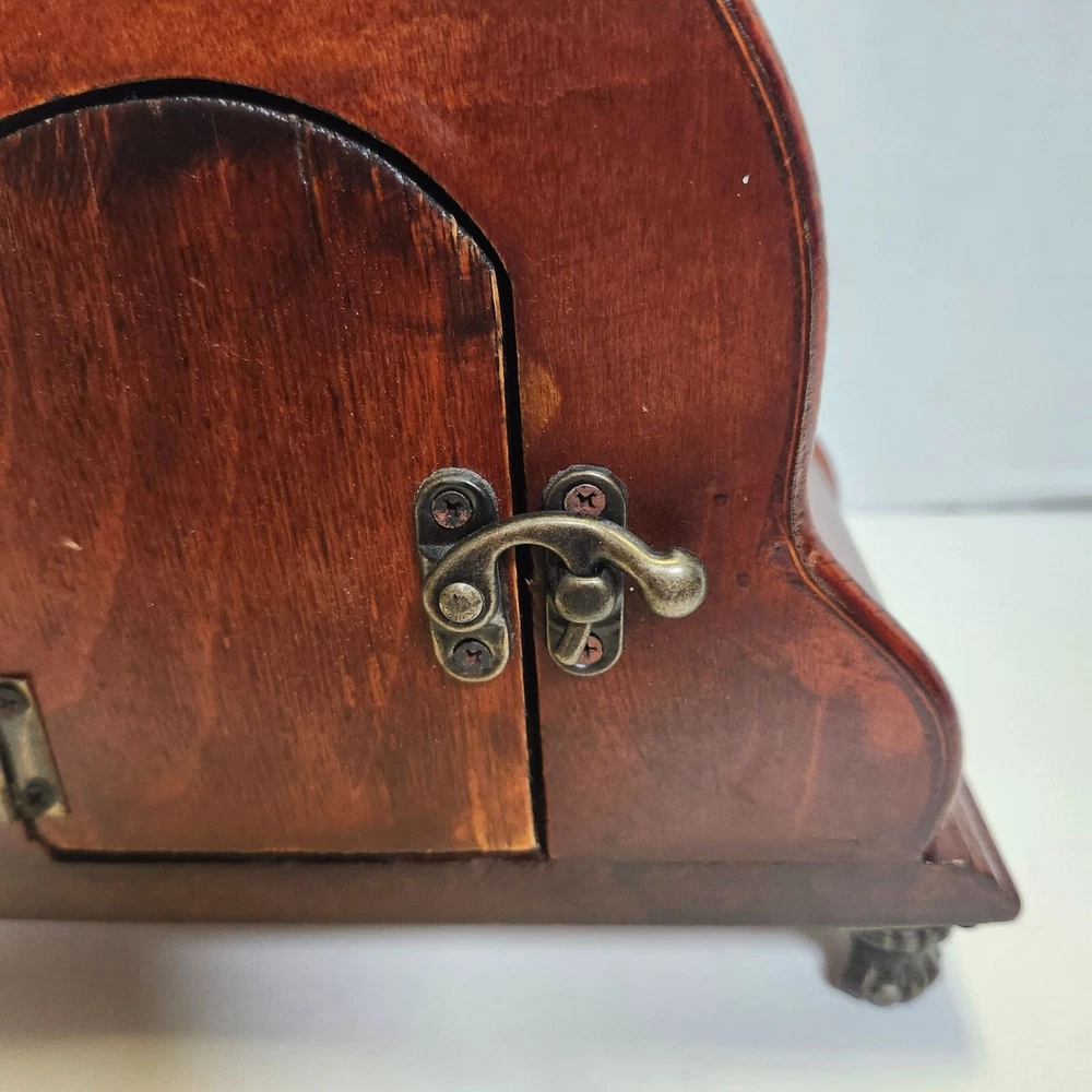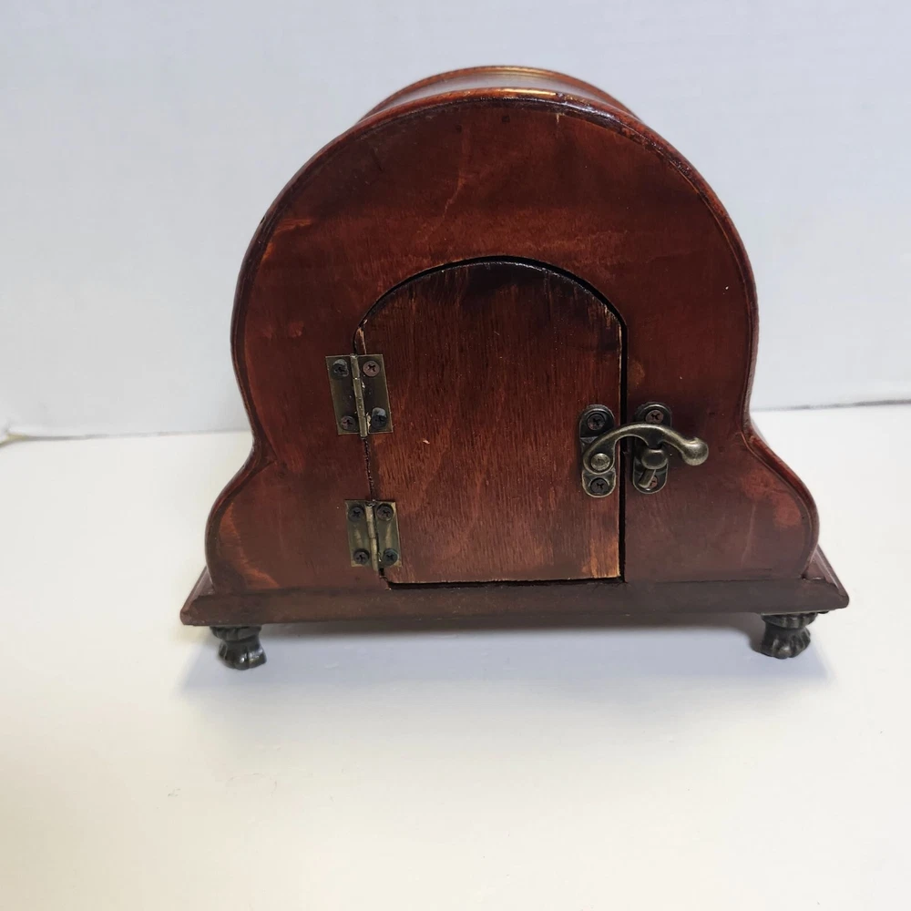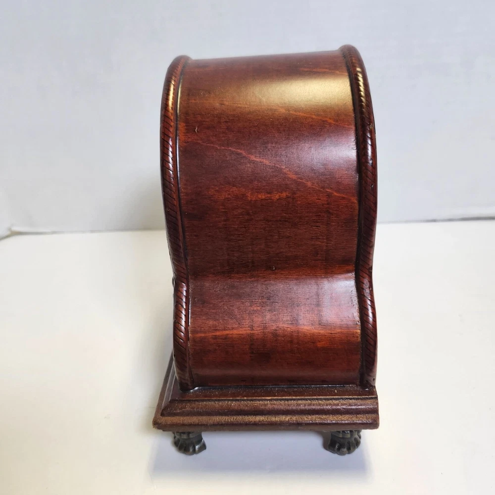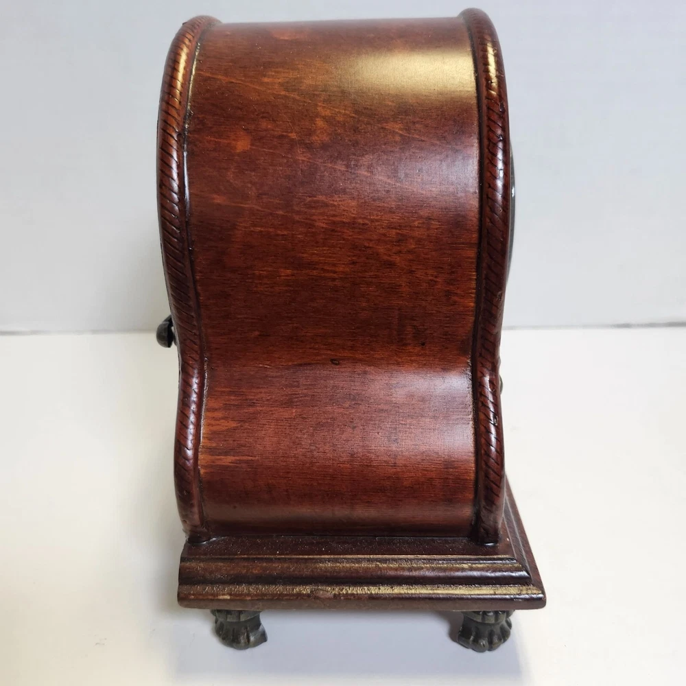 Elegant antique wooden mantel clock featuring brass accents and Roman numerals. A charming addition to any home decor, combining functionality and classic style. • Wooden construction • Brass accents • Roman numeral clock face • Decorative front and back • Height: 8 inches • Width: 8.5 inches Minor scratches on wood, latch on back door.