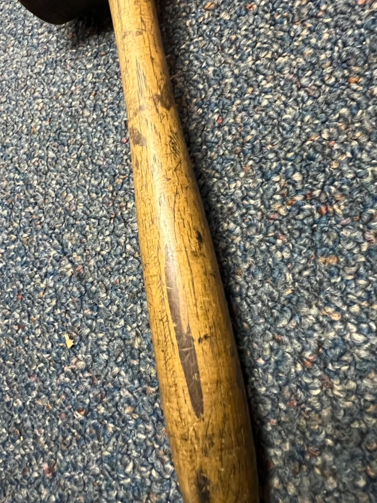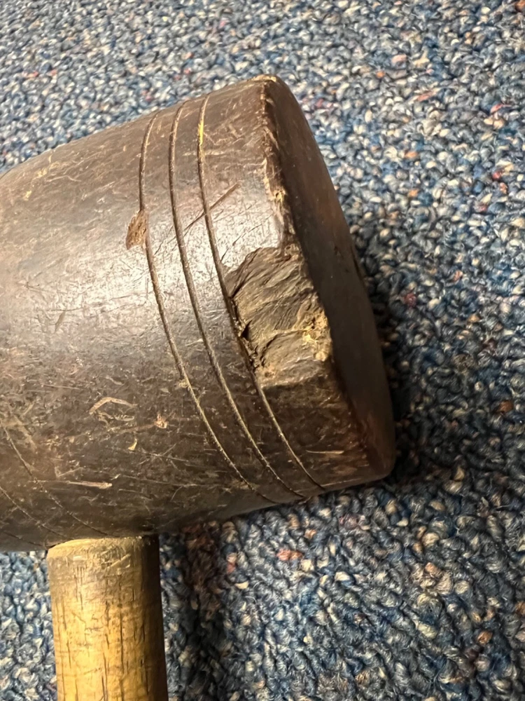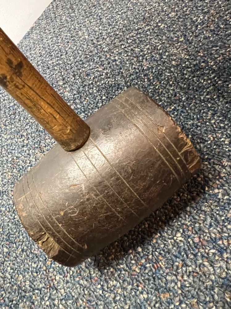 Here's a magnificent old lignum vitae mallet. Weight is 1 lb, 9 oz. There's no mark or brand visible. Handle length is 9", head length is 4 1/4", diameter is 3". The head has its share of dings and chips, and a couple of fissures in the striking faces, but considering it's likely well over 100 years old, it's in remarkably good condition. See pics. The handle is in great shape, with just surface marks, but no real damage. The head and handle are firmly mated. This one probably built a few post-and-beam buildings in its day. Its patina is off the charts. - a real treasure from the past.