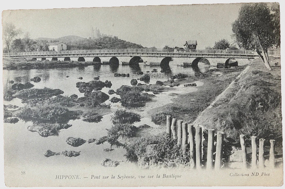Antique postcard: Bridge over the Seybouse looking toward St Augustin Basilica, Hippone, Algeria. Unposted, excellent condition. My grandfather bought this in 1906. He was in the US Navy from 1904 to 1907.