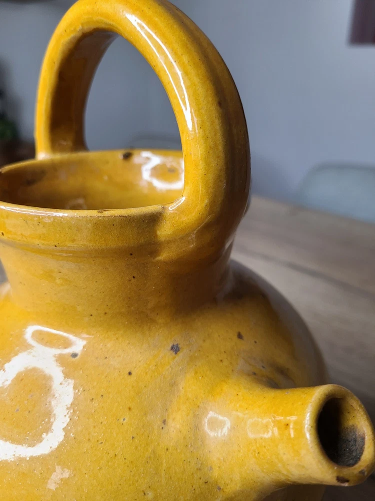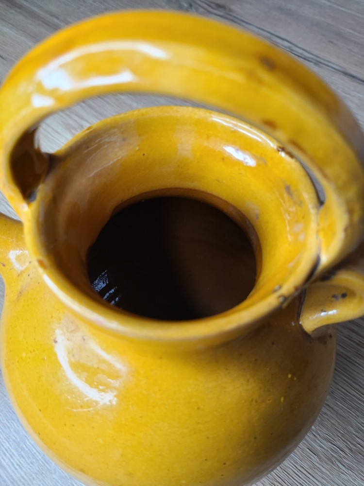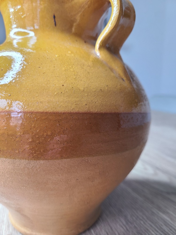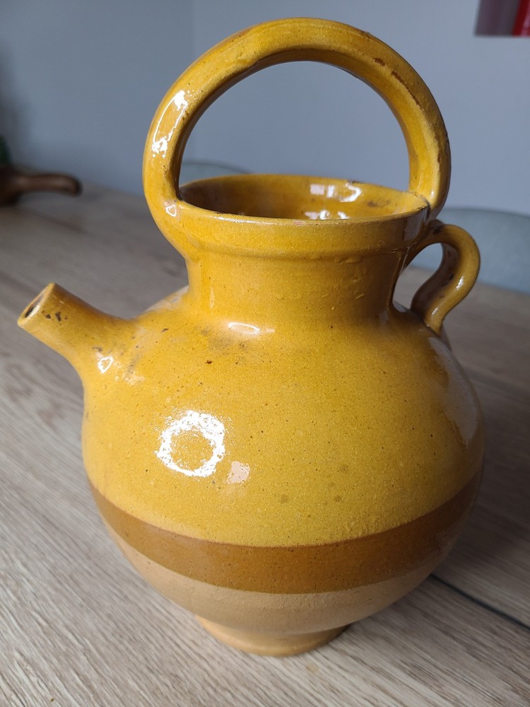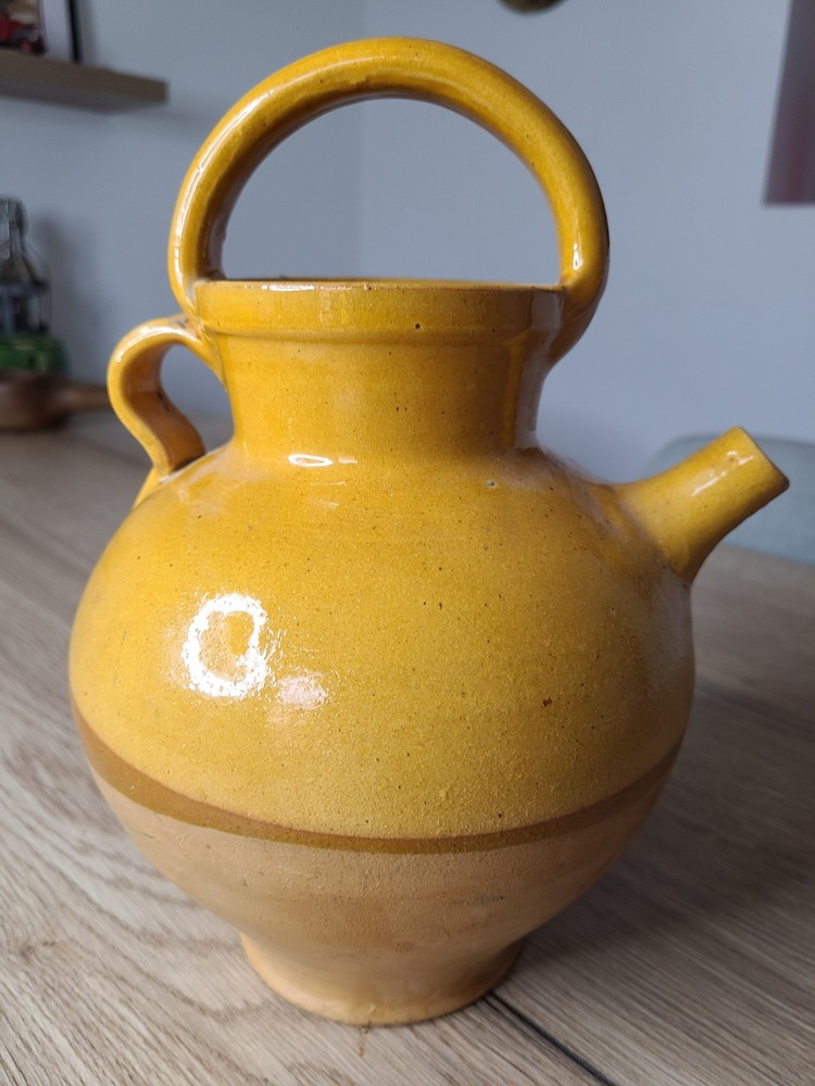 Ancienne cruche à eau en terre cuite vernissée. Magnifique cruche vintage en terre cuite vernie, céramique. France. En excellent état vu l'âge. Très bel objet décoratif notamment pour une cuisine. Avec une anse latérale, une anse sur la partie supérieure et un bec verseur. Dimensions, hauteur 27 cm, largeur 18 cm.