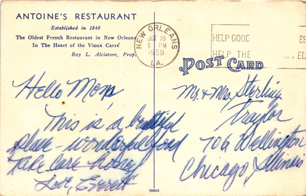MAKE AN OFFER. THE MORE YOU BUY THE BETTER DEAL I WILL ACCEPT Antoine's Restaurant is a historic dining establishment located at 713 St. Louis Street in New Orleans, established in 1840. It is known as the oldest French restaurant in the city and is situated in the heart of the Vieux Carré, or French Quarter. The restaurant was founded by Antoine Alciatore and is currently run by Roy L.