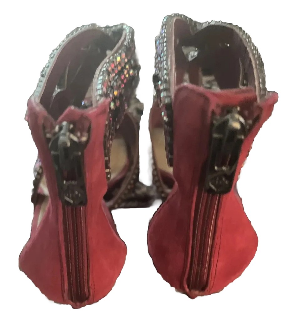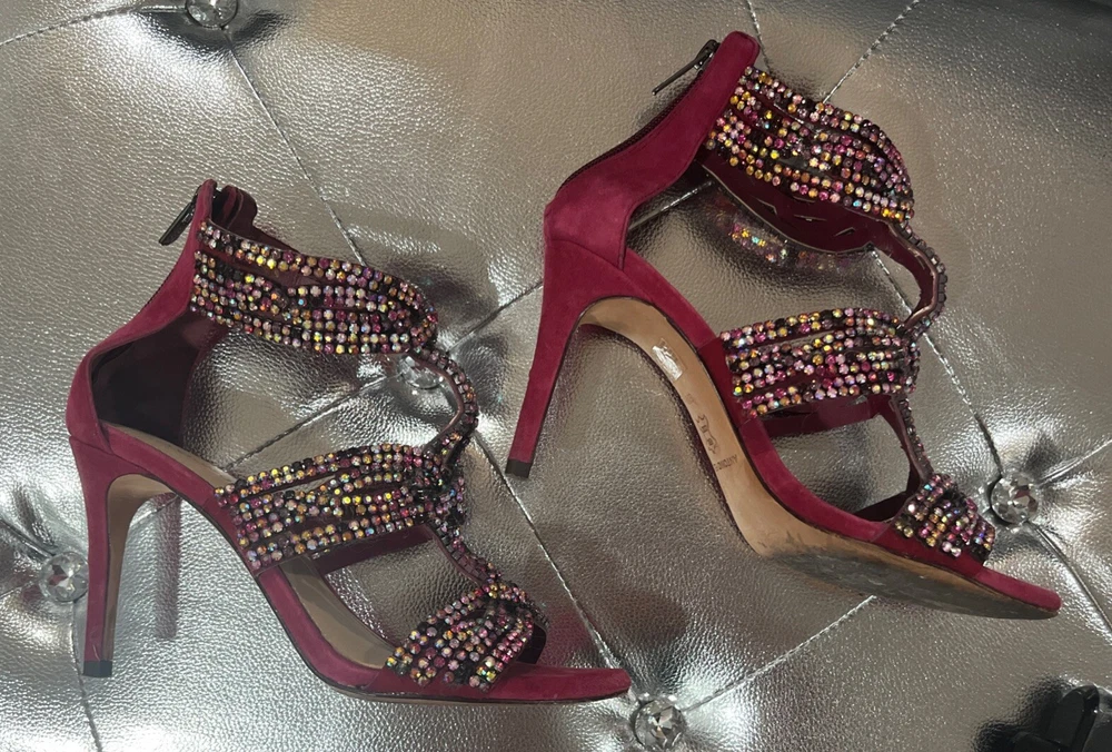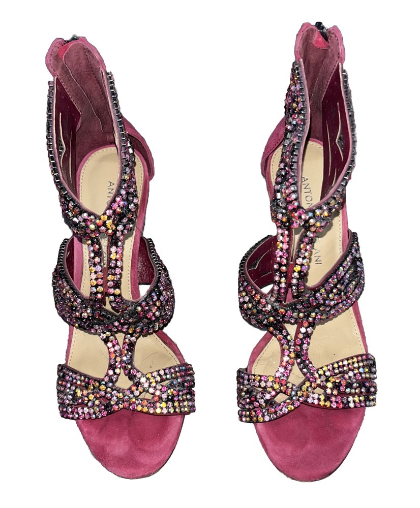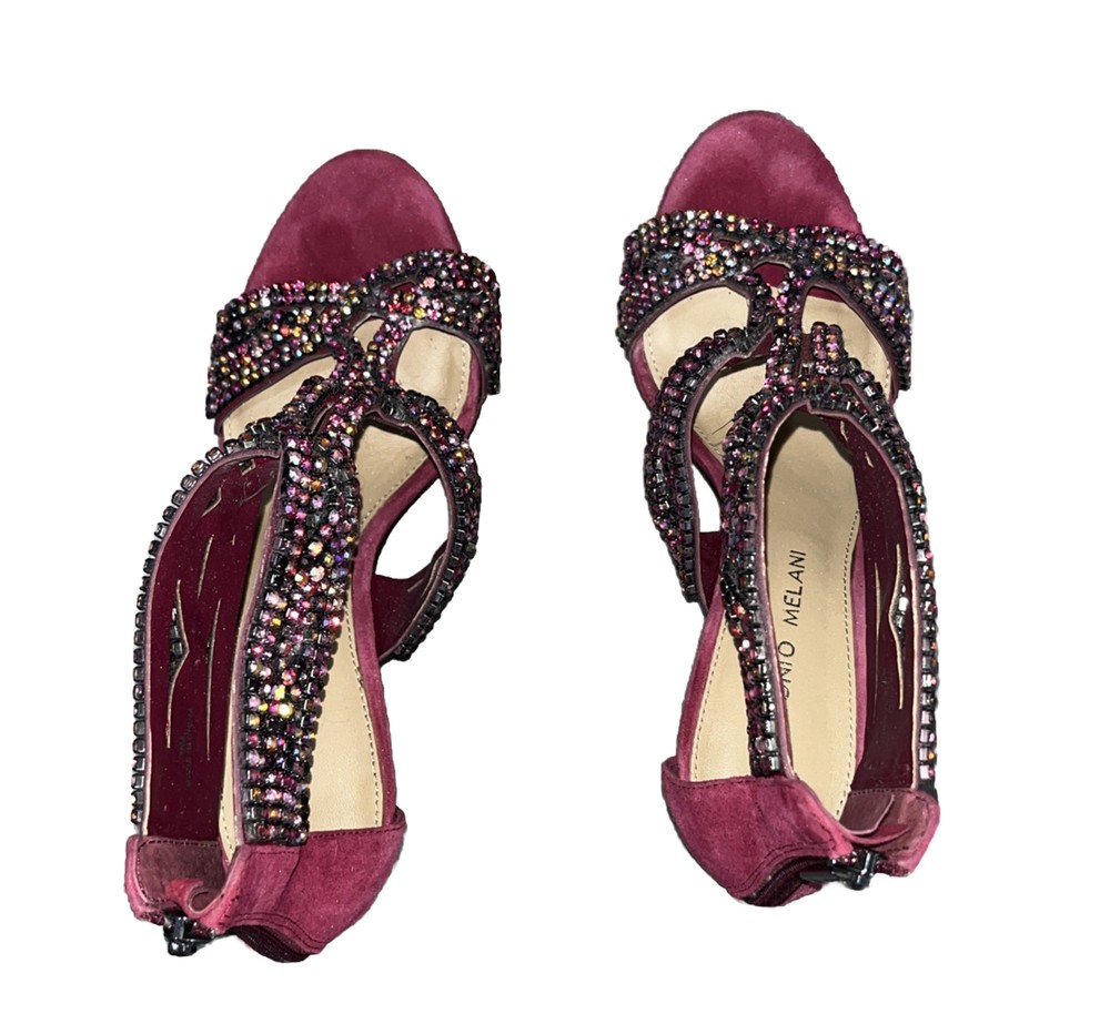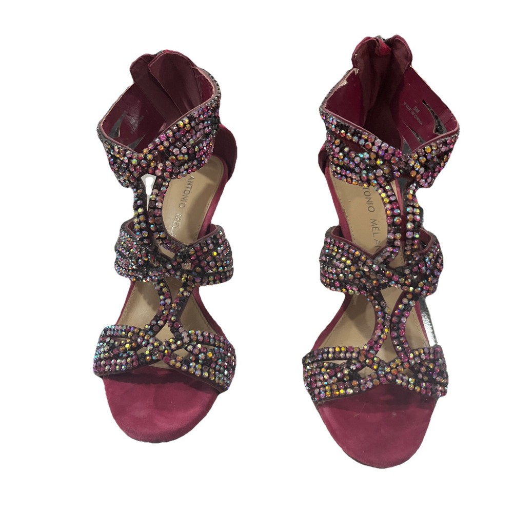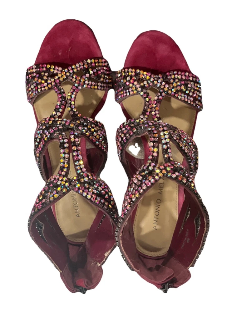 Elevate your style with these stunning Antonio Melani heels featuring a multicolor pattern, open toe, and a stiletto heel style. The zipper closure adds convenience while the suede lining and breathable features keep you comfortable all day long. Perfect for all occasions including travel, wedding, party, cocktail, and even workwear, these heels are a must-have in your shoe collection. Accessorized with rhinestones, sequins, and a suede outsole, these designer heels are perfect for formal events, clubwear, birthdays, Christmas, Valentine's Day, and even gambling. Available in size six and in a beautiful maroon color, these heels are lightweight and suitable for all seasons including winter, summer, fall, and spring. Invest in this gorgeous Antonio Melani model, and add a touch of elegance to your wardrobe. On Feb-10-25 at 21:34:04 PST, seller added the following information: Antonio Melani stilettos, maroon color. Man made leather maroon colored accent with multicolored rhinestones all over. Size 6, zips in the back, has leather soles. Heels are in very good condition and are not missing any rhinestones or beading.
