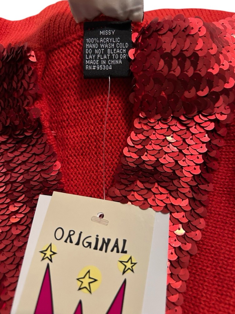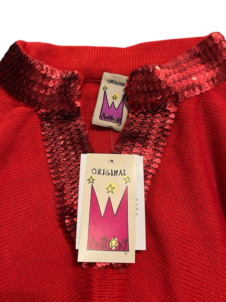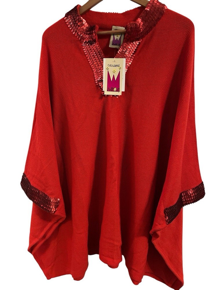 This is a vintage Anttony Design Originals pullover poncho for women, featuring a V-neckline, long sleeves, and a solid red color. Made of breathable acrylic material with sequin accents, this woven poncho has a sparkly look and a lagenlook style. It is brand new with tags and is designed in a regular size for women.