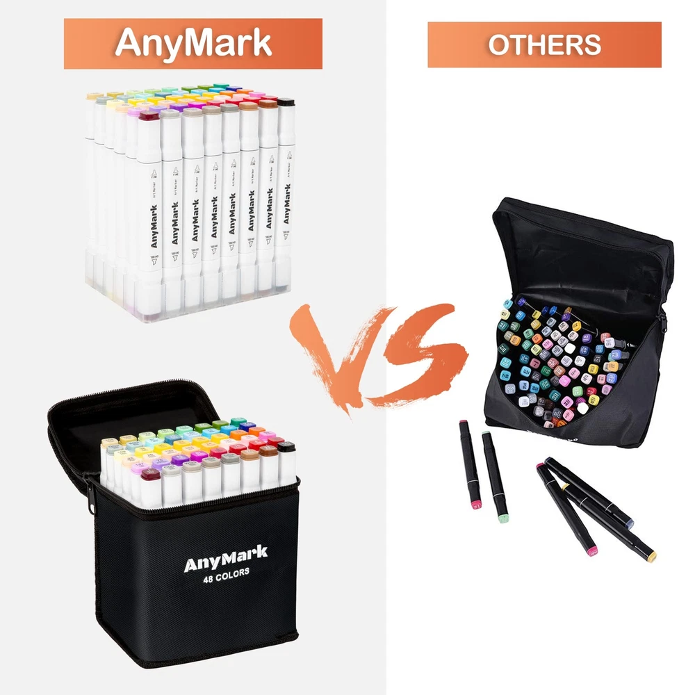 Rich Vibrant Colors: Dive into 48 vibrant alcohol markers tailored for artists at any stage. Effortlessly blend using our colorless blender for boundless creative expression. Unleash your inner artist with our premium markers today! Chisel & Fine Dual Tips: AnyMark art markers are designed with a unique dual-tip that offer versatility and precision in one marker.The broad chisel tip (1-6mm) is perfect for quick coverage, while the fine bullet tip (1-2mm) allows for details. You can effortlessly switch between broad strokes and fine details, making your creative process smoother and more enjoyable! Easy to Organize: AnyMark alcohol markers set comes with a base tray at the bottom of the case that allows each marker to be stored independently.Equipped with a high-quality black carrying case perfect for traveling and storing.Say goodbye to messy workspaces and hello to a more efficient creative process! Alcohol-Based Ink: The high-quality ink is quick-drying,smooth and evenly,blends seamlessly to achieve beautiful coloring effects.Each marker has a color recognition code,so you can easily identify and choose colors by color-coded caps.The caps also keep tips from drying out,please cover it in time when you finish.It is a ideal gift for kids,students,friends,Christmas,Thanksgiving Day and other festivals. Using Tips: As AnyMark drawing markers are alcohol-based ink like all other brand alcohol markers,they will bleed through regular paper.When you paint,please put a piece of paper under the work or use special thick marker paper to avoid leakage.We attach great importance to your opinions,please feel free to contact us at any time if you are not satisfied with our products or have any questions