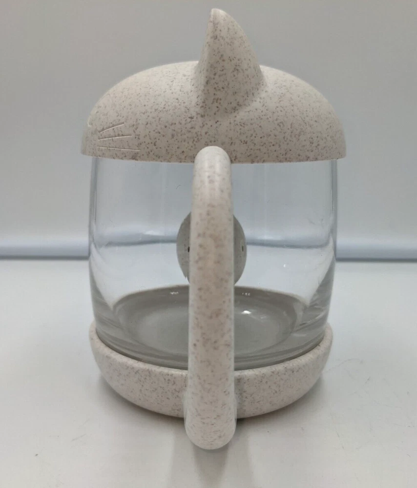 This is a cute glass cat mug (his head is the lid to the cup and the tail is the handle) with an infuser for tea in the shape of a fish. It is a beige color and clear glass and will hold about 8 ounces. I am a careful and thorough packer, but for some of the items I sell, I’m not able to use combined shipping because of their size or propensity to break if put into a box with other items. If you purchase more than one item from my store and ask for combined shipping, I will do my best to accommodate your request. I will accept any reasonable offer so please feel free to send your offer. T hank you for visiting my store. I hope to see you again soon!