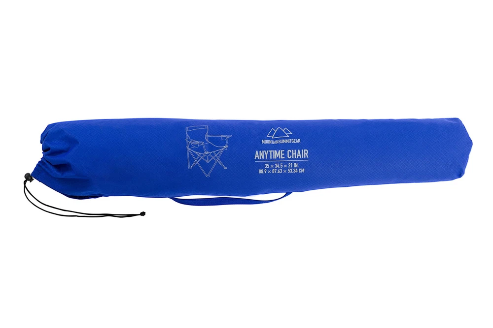 The Anytime Chair is the perfect folding chair for every event. Great for camping, sporting events, backyards, concerts and more, our comfortable and durable camping chair has 2 mesh cup holders, durable fabric, and a strong frame. The -coated steel frame and durable seating holds up to 300 lbs, and includes a carry bag with strap for easy transport and storage. Sit back and relax with extra large cup holder for large beverages or gadgets and standard cup holder for your smaller beverages. Never stop the adventure. At , we share your passion. It's why we design and build the finest camping accessories and outdoor gear. Our products are manufactured to meet the highest performance, comfort, and durability you expect. Want to make the most out of every time you explore or rediscover your favorite spot? You've come to the right place. Foldable & Portable: Great for camping, sporting events, backyards, concerts and more, the comfortable Anytime chair has 2 mesh cup holders, durable fabric, and a strong frame. Perfect for Every Event: Our camping chairs for adults feature extra-large cup holder for large beverages or gadgets and standard cup holder for your smaller beverages, so you can sit back and enjoy any event. Durable Camping Chair: Get maximum comfort and durability. The frame is made from 19mm -coated steel with strong, polyester fabric to hold up to 300 lbs. The polyethylene coating makes it stand up to any weather. Made for On the Go Fun: Our folding chair can be used as camping chairs, patio chairs, stadium seats, a beach chair, and so much more. Includes a carry bag with strap for ease of transport and storage. Dimensions: 35 x 34.5 x 21 in. Never Stop the Adventure: At , we provide premium camping accessories and outdoor gear. Our products are manufactured to meet the highest performance, comfort, and durability you expect.
