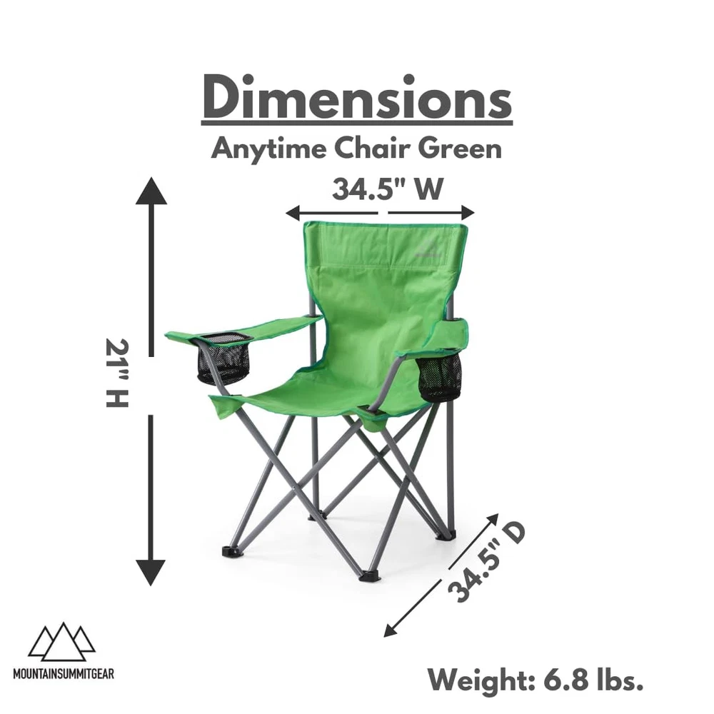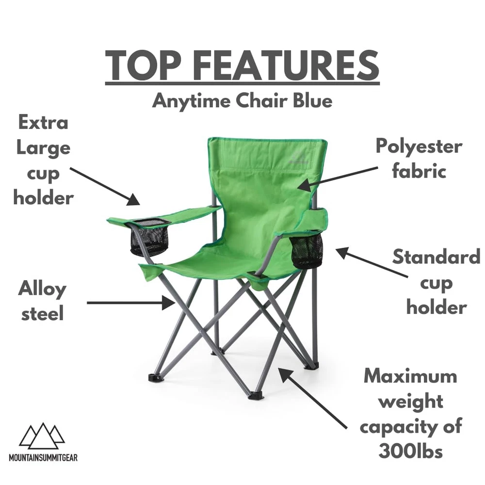 The Anytime Chair is the perfect folding chair for every event. Great for camping, sporting events, backyards, concerts and more, our comfortable and durable camping chair has 2 mesh cup holders, durable fabric, and a strong frame. The powder-coated steel frame and durable seating holds up to 300 lbs, and includes a carry bag with strap for easy transport and storage. Sit back and relax with one extra large cup holder for large beverages or gadgets and one standard cup holder for your smaller beverages. Never stop the adventure. At , we share your passion. It's why we design and build the finest camping accessories and outdoor gear. Our products are manufactured to meet the highest performance, comfort, and durability you expect. Want to make the most out of every time you explore or rediscover your favorite spot? You've come to the right place. Foldable & Portable: Great for camping, sporting events, backyards, concerts and more, the comfortable Anytime chair has 2 mesh cup holders, durable fabric, and a strong frame. Perfect for Every Event: Our camping chairs for adults feature one extra-large cup holder for large beverages or gadgets and one standard cup holder for your smaller beverages, so you can sit back and enjoy any event. Durable Camping Chair: Get maximum comfort and durability. The frame is made from 19mm powder-coated steel with strong, polyester fabric to hold up to 300 lbs. The polyethylene coating makes it stand up to any weather. Made for On the Go Fun: Our folding chair can be used as camping chairs, patio chairs, stadium seats, a beach chair, and so much more. Includes a carry bag with strap for ease of transport and storage. Dimensions: 35 x 34.5 x 21 in. Never Stop the Adventure: At , we provide premium camping accessories and outdoor gear. Our products are manufactured to meet the highest performance, comfort, and durability you expect.