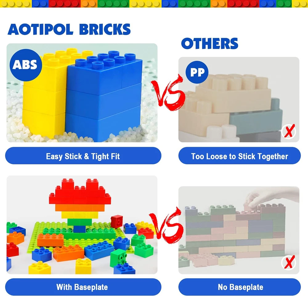 Store New Arrivals Add to Favorite View Feedback Contact Aotipol Building Blocks for Kids Toddlers Including a Baseplate, 101-Piece Large Classic Building Bricks Set for Kids of All Ages, Basic STEM Toys Gift, Compatible with All Major Brands Description Item Weight 2.27 pounds Item model number a18bb Manufacturer recommended age 18 months and up Package Dimensions 11.42 x 10.71 x 3.66 inches Manufacturer aotipol WHAT YOU GET: Each large building blocks set includes 75 square bricks (2x2 pegs), 25 rectangle bricks (2x4 pegs) and a baseplate for these bricks. Bricks and plate are compatible with all major brands. BONUS BASEPLATE: The possibilities are limitless with the green building plate. Children can build, play, and display all of their favorite creations on the plate which measures 10 inches. Expand kids' creative play and learning possibilities. LARGE SIZE AND TIGHT FIT: These aotipol blocks are bigger, easier for kids to work with and fit perfectly onto the baseplate. They connect firmly together lasting for years. Every piece is large enough to avoid any choking hazard. Great toys for ages 2-4. Mom's choice! LEARNING WHILE PLAYING: The building toys come in two different sizes (square and rectangle) for optimum building fun. Let your child’s imagination run wild! The set of 100 bricks is a great way to teach your toddler creativity, help improve hand-eye coordination, and aid in mental development. Sorting the pieces by shape and color also brings hours of fun. GIFT FOR TODDLERS 18 MONTHS & UP: Actually it is wonderful for all ages with varying interests. Made from ABS plastic rather than PP, non-toxic and kid-friendly. Great for younger kids because they are easier to assemble with little hands. Round edges will not hurt. It's an educational toddler toy that makes a great holiday, birthday or any day gift for both boys and girls. Product Description The video showcases the product in use. The video guides you through product setup. The video compares multiple products. The video shows the product being unpacked. Big Building Blocks 100 pieces Classic Bricks in 5 Colors Large Building Bricks STEM Toy for All Ages compatible with major brands. Our big Size of Building Blocks can hold tightly together, providing an excellent playing Experience for your Kids. Boost Imagination & Creativity Kids can continuously develop their imagination while playing and building. They can make creations of their own by mixing the bricks. Safe Size Design The size of our Building Bricks is larger than 1.3 in. Through the small object test tube, it meets with the toy small parts regulations. Bring more fun to children under the premise of safety. Variety Beautiful Colors and Shapes 5 different colors make it possible to build different scales or projects, giving children a wonderful visual experience while also improving their ability to recognize and match colors. Tight Fit The building blocks are made from ABS material with built-in card slots. So we just need to insert it lightly and blocks can be connected tightly. Easy to Clean The classic blocks can be washed with water to maintain their cleanliness. Ideal Gift for Any Occasion A variety of different basic colors and shapes of the bricks set are nicely packed in a beautiful box. It will be the perfect gift for your kids, grandkids, nephews or nieces for their birthday, Christmas or any other occasion. 100PCS Big Building Block Building Blocks 100 Pieces 150 √ Bottom Plate √ ABS Material ABS 2 Shape Quantity 4 18 month+ Age 18 month+ 100 Pieces 232 √ Bottom Plate √ ABS Material ABS 2 Shape Quantity 42 18 month+ Age 3+ 150PCS Big Building Block Drill Playset ABOUT US We offer the best prices around on high quality products. Our E-store includes media such as books, movies, music and games while offering electronics, toys, sporting apparel, clothing, tools, general home, garden items and more. SHIPPING We are always working hard to ensure your package arrives as soon as possible. Please understand that some factors like weather, high postal traffic, and the performance of shipping companies are outside of our control. We offer free shipping to the lower 48 states and ship within 2 business days of payment, usually sooner. We do not accept P.O. Boxes. Please provide a physical address. RETURNS We offer a 30-Day Return Policy on items which you are not completely satisfied with. You have the option for a full-refund or an exchange of the item. No returns are available on items shipped outside of the USA. PAYMENT We accept PayPal. CONTACT US This page content is yet to come Please ad us to your favorite seller and visit again later Thank You CUSTOMER SATISFACTION We try our very best to make sure every customer is completely satisfied. If there's a problem, message us! We're happy to help.