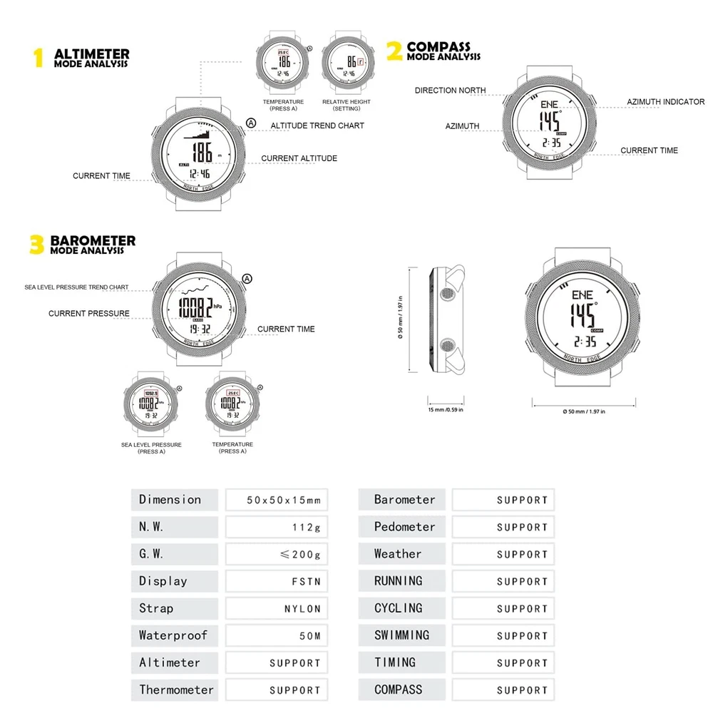 FUNCTION 1, Altimeter (altitude trend chart and climb rate) 2, Barometer ( air pressure trend chart) 3, Compass 4, Thermometer 5, Weather Forecast, World Time 6, Pedometer, step counter, calorie, distance record 7, Time functions: hour, minute, second, year(2000-2099), month, date, weekday, 8, Alarm clock (2 sets alarm clock, ) 9, Countdown timer (99:59:59~0) 10, Stopwatch (0~:59:59), 12, Worldtime functions 13, Corporates digital compass, altimeter, barometer, Thermometer, air pressure trend and altitude trend and altitude trend 14, Button tone on or off 15, Battery life remind 16, EL Backlight ++Battery life: 18 months+Function Brief:Compass, Altimeter,Barometer , Thermometer,Weather Forecast, World Time,Dual Time,Pedometer, calorie, distance record,2 sets alarm,Countdown timer ,Stopwatch, EL Backlight. Materials: Solid metal case with durable and breathable nylon band(1set extra silicone band for exchange ) ,Japenese battery. (CR2032 18months life). Watch Size: Diameter: 50mm/1.97in; thickness: 16mm/0.63in; width of band: 24mm/0.94in; net weight: 117g/4.12oz.(since it is a little big and heavy ,please kindly check if it meet your needs) Waterproof: 50M waterproof, means you could wearing it for swimming (not diving), don't push the button when it is under water, also do not wearing it for hot water bath, it will reduce its life span. Package Include: Watch X1; manual X1, extra silicone band X1, packed in a black square gift box.