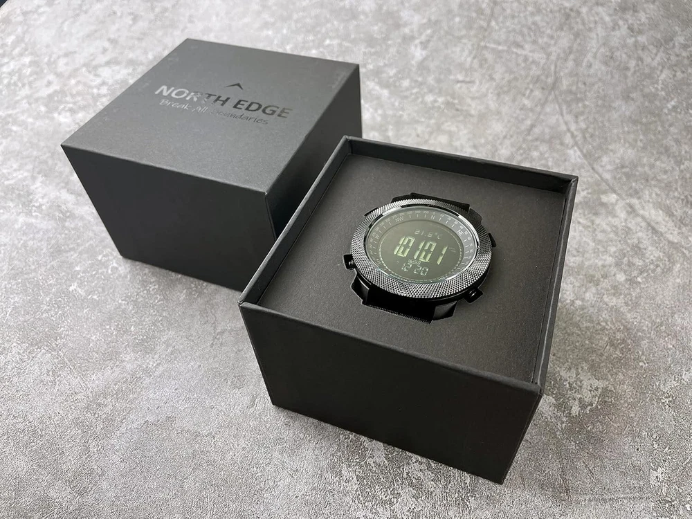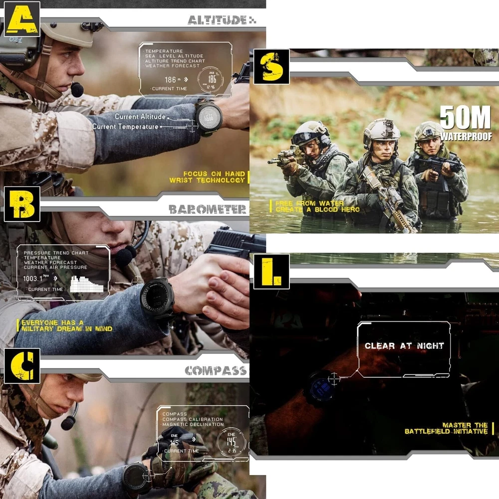 Apache Tactical Sports Watches for Men , Outdoor Survival Military Compass Rock Solid Digital Watches with Durable Band, Steps Tracker Pedometer Calories Green… ++Battery life :18 s +Function Brief:Compass, Altimeter,Barometer , Thermometer,Weather Forecast, World Time,Dual Time,Pedometer, calorie, distance record,2 sets alarm,Countdown timer ,Stopwatch, EL Backlight. Materials: Solid metal case with durable and breathable nylon band(1set extra silicone band for exchange ) ,Japenese battery. (CR2032 18s life). Watch Size: Diameter: 50mm/; thickness: 16mm/; width of band: 24mm/; net weight: 117g/(since it is a little big and heavy ,please kindly check if it meet your needs) Waterproof: 50M waterproof, means you could wearing it for swimming (not diving), don't push the button when it is under water, also do not wearing it for hot water bath, it will reduce its life span. Package Include: Watch X1; manual X1, extra silicone band X1, packed in a black square gift box. FUNCTION 1, Altimeter (altitude trend chart and climb rate) 2, Barometer ( air pressure trend chart) 3, Compass 4, Thermometer 5, Weather Forecast, World Time 6, Pedometer, step counter, calorie, distance record 7, Time functions: hour, minute, second, (2000-2099), , date, weekday, 8, Alarm clock (2 sets alarm clock, ) 9, Countdown timer (99:59:59~0) 10, Stopwatch (0~:59:59), 12, Worldtime functions 13, Corporates digital compass, altimeter, barometer, Thermometer, air pressure trend and altitude trend and altitude trend 14, Button tone on or off 15, Battery life remind 16, EL Backlight