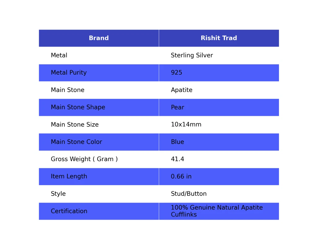 Set the trend with this stylish 925 Sterling Silver Cufflinks studded with Apatite sparkling. Give your looks a little treat by wearing this exclusive ornament. ---------------------------------------------------- ------------ Welcome to Our Shop Rishittrad ---------------------------------------------------- ------------ Description:- SKU :- CL-6-5 Metal :- Sterling Silver Metal Purity :- 925 Gemstone :- Apatite Gemstone Color :- Blue Gemstone Shape :- Pear Gemstone Origin :- Setting :- Channel-Set Cufflink Lenght : - 0.66 Inches ---------------------------------------------------- ------------ -------- ------------ Elegant Birthday Tribute:- Discover the essence of sophistication with our Birthday Radiance collection. Crafted with exquisite attention to detail, each piece embodies the timeless elegance and symbolic significance of birthdays. Craftsmanship Excellence:- Meticulously fashioned from premium 925 sterling silver, our jewelry pieces boast a classic and enduring design. The rich tones of natural gemstones complement the silver setting, creating a captivating harmony that resonates with wisdom and truth. Symbol of Personal Growth:- Gift with intention and meaning. Our Emblem of Wisdom pieces symbolize heartfelt wishes for personal growth and enlightenment on the recipient's special day, making it a cherished gesture of love and appreciation. Versatile Elegance:- Measuring at 1.2 inches, our creations seamlessly blend into any ensemble, offering both daily wearability and the ability to elevate sophisticated looks for special occasions. Their adaptable design ensures they become treasured additions to any jewelry collection. Thoughtful Expression of Love:- Surprise your beloved with a gift that transcends mere adornment. Our Natural Gemstone 925 Sterling Silver collection is a stylish and thoughtful token, exuding elegance and emotion while conveying warmest wishes with enduring grace. Exquisite Presentation:- Delight in the joy of gifting with our meticulously presented pieces, elegantly housed in an exquisite gift box. Make their birthday truly memorable by presenting them with a gift that captures the allure and timeless elegance of sterling silver. -------------------------- Image Policy----------------------------- All images are captured in natural lighting. The product showcased is the exact item you'll receive. -------------------------- Delivery Policy-------------------------- Standard Shipping typically takes 15-25 days, depending on your location. For expedited shipping, additional charges will apply. --------------------------- Product Policy--------------------------- You will receive the exact product depicted in the photos. All items are meticulously handcrafted. ------------------------------ Order Policy------------------------------ We welcome orders from around the globe. Custom orders are also accepted. Bulk orders are available upon request. Should you have any queries about our products, please don't hesitate to reach out. Upon receiving your product, we'd appreciate your feedback. ⋆⋆✦✧✦⋆⋆⋆⋆✦✧✦⋆⋆⋆⋆✦✧✦⋆⋆⋆⋆✦✧✦⋆⋆⋆⋆✦✧✦⋆⋆⋆⋆✦✧✦⋆⋆⋆⋆✦✧✦⋆⋆ "Discover a captivating collection of handcrafted gemstone jewelry at our boutique." https://www.ebay.com/str/rishittrad0 ♥ Thank you for choosing us ♥