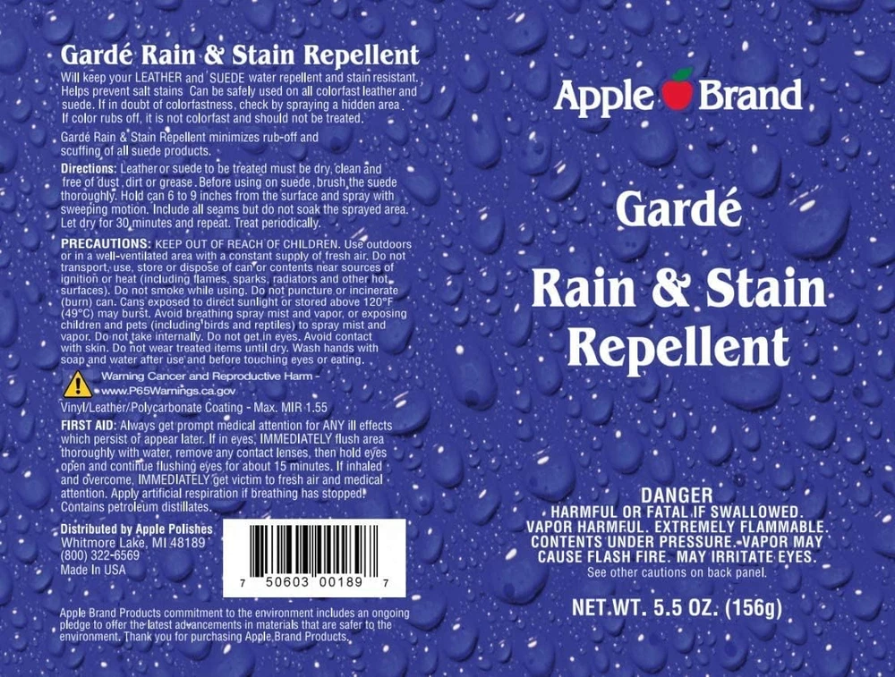 SAFE FROM RAIN & STAINS: Garde will make sure that your handbag and shoes are safe if you get caught in the rain. By forming an invisible protective layer, Garde keeps your products free from water spots, salt stains, body oil, grease, perspiration, coffee, wine, and any other dangers to your leather goods. WON’T AFFECT APPEARANCE: Apple Brand Garde will not alter the color or shade of your products, or leave any sticky or gummy residues. Our products are trusted by some of the biggest names in fashion and are recommended time and time again for their gentle yet effective care on leathers and fabrics. USE ON ALL YOUR FAVORITE PRODUCTS: Great for handbags, purses, heels, flats, shoes, boots, wallets, belts, furniture, car interiors, and more! MADE IN USA - SATISFACTION GUARANTEED: We are proud to keep all of our manufacturing and customer service in the USA and stand behind all of our products 100%. If for any reason you are unsatisfied with your order please let us know and we will be sure to make it right! New