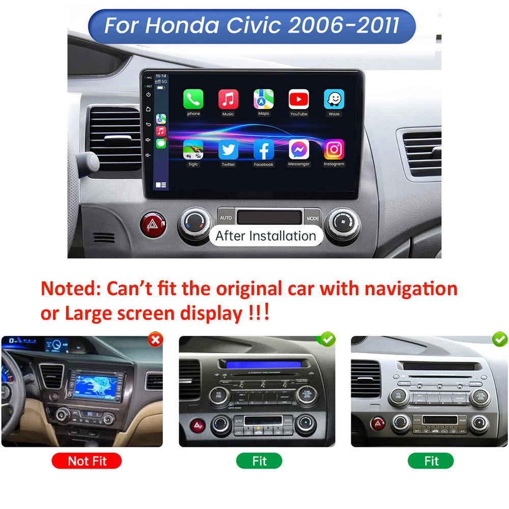 Apple CarPlay For Honda Civic 2006-2011 Android 12.0 Car Stereo Radio GPS WiFi 10.1" FOR Honda Civic 2006-2011 Android 12 CARPLAY CAR GPS STEREO NAVI RADIO WIFI 32GB Android 12 Car Stereo For Honda Civic 2006-2011 GPS Carplay Radio +Camera Features: Noted: Can't fit the original car with navigation or Large screen display !!! ●HD 10.1' 2.5D Capacitive touch screen ● Wireless & Wired Carplay : wired or wireless Carplay in-vehicle system can closely integrate the user's iOS device and iOS experience with the dashboard system. Users who use wireless Carplay can connect to the car system via Bluetooth to realize voice-controlled navigation, make calls, send and receive messages, and listen to music. It is only available for iPhone . ● Wireless & Wired Android auto : wired or wireless Android auto in-vehicle system can closely integrate the user's Android device and Android experience with the dashboard system. Users who use wireless Android auto can connect to the car system via Bluetooth to realize voice-controlled navigation, make calls, send and receive messages, and listen to music. It is only available for Android phone(Android phones need to download android auto APP) . ●Built-in GPS Navigation: Users can purchase directly from play store for offline navigation. With wifi connected, Google Maps can be used perfectly, you can go anywhere you want and never get lost again. ● High definition 1080P: Full capacitance touch screen for easy operation, well designed user interface for car only. ●Built-in WIFI: Connect to WIFI, and you will find a new world,the most convenient one is the online map. ●Rear camera: support AHD high-definition 1080P camera image input. ●Hi-Fi function: High fidelity, reproduced sound highly similar to your original sound ●Steering wheel control: Through it you can control the functions you need by steering wheel, more convenient ●Built-in Bluetooth with A2DP/Hands Free/Phone book:Bluetooth hands-free calls,Bluetooth music player,Auto loading phonebooks ● Double USB adapter input ●Support file manager: Support download, install and delete over thousands of android apps ●Support multilanguage: Support languages, up to 40 national languages ●You can enjoy music from you mobilephone without any cables, and also support USB connetion. ●FM Radio: Online music you can transfer the music to the car stereo by FM to enjoy the original car stereo sound,with 18 preset stations ●Time Setting:You can use the network or GPS to open the date and time automatically, or you can adjust it manually. ●Support external microphone Specifications: System:Android 12 Screen size: 10.1'' Memory: 2GB (RAM)+32GB (ROM) Screen Resolution:1280*800 CPU: 4 cores Bluetooth Version:5.0 Power output:4*45W Voltage:DC 12V Work temperature:-20℃-70℃ Apple CarPlay: Support Wireless/Wired Connection Android Auto: Support Wireless/Wired Connection Wifi:Support GPS:Support Steering wheel control function:Support camera: support (Backup camera included) Reversing input: AHD/CVBS Video output:Support Maps:Built-in offline maps(requires internet to download data) USB:Double USB interface Radio Band:FM Audio format:APE/FLAC/WAV/MP3/WMA etc Video format:MKV/RMVB/AVI/MP4/MDV etc Picture format:PNG/JPEG/JPG/GIF/WBMP/BNP etc Bluetooth keyword:0000 Factory setting keyword: 3368 Language:English, Arabic, Russian, Hebrew, Spanish, Italian, French, Thai, German, Japanese, Korean, Turkish, Czech, Hungarian, Dutch, Polish, Swedish, Ukrainian, Romanian, Greek, Danish, Finnish Package Included : 1 x Car MP5 Player 1 x Power Cable 1 x GPS Antenna 1 x Camera 1 x Rear Camera lnput Cable 1 x RCA Cable 2 x USB Cable 1 x Crowbar 1 x Instruction manual Notes: We provide clear pictures, measurements where possible. Please check as much as possible to make sure the item is the one that you need. Please allow 0.5-1 inch difference due to manual measurement.(1inch=2.54cm) Vehicle Compatibility Chart May Vary Depending On Vehicle Options, Production Dates, And Install Application. Please Inquire Before Purchase. Instruction is for Reference.Professional Installation Is Highly Recommended!!If you want to know how to use or install it,please contact us by Email.We will provide help as much as possible. Payment Delivery details Terms of sales About us Contact us Payment 1.We accept Payoneer 、 PayPal 、 Mastercard 、 VISA 、 Google Pay 、 American Express etc. 2.All major credit cards are accepted through secure payment processor. 3.Payment must be received within 7 business days of auction closing. 4.We ship to your eBay address. Please make sure your eBay address is correct before you pay. Delivery details Product will be shipped within 1 business days after full payment is received and verified. All domestic orders will be shipped via USPS, UPS or FedEx from our US warehouse and usually arrives to your door in about 3-5 business days. Delivery time depends on destination and other factors. We ship the package to your shipping address in eBay instead of the one in PayPal. Please tell us your shipping address if it is different from the one in eBay. The tracking number will be given for the customer to check the shipping status online (registered or faster service only). We are not responsible for any wrong or undeliverable addresses. Please verify and update your shipping address on eBay during checkout. Terms of sales We hope that you will be pleased with your order. However, in the event that your order is not suitable, we are happy to accept returns for a refund (excluding postage) or an exchange with 30 days of purchase. It is very important that you include a note with your eBay ID, name, reason for returning and return requirements. In the event of a return, the customer is responsible for postage costs. It is highly unlikely that a product may be faulty, however in the case returning postage will be refunded on arrival. Exchange and Refund Process Returns are handled on a daily basis the