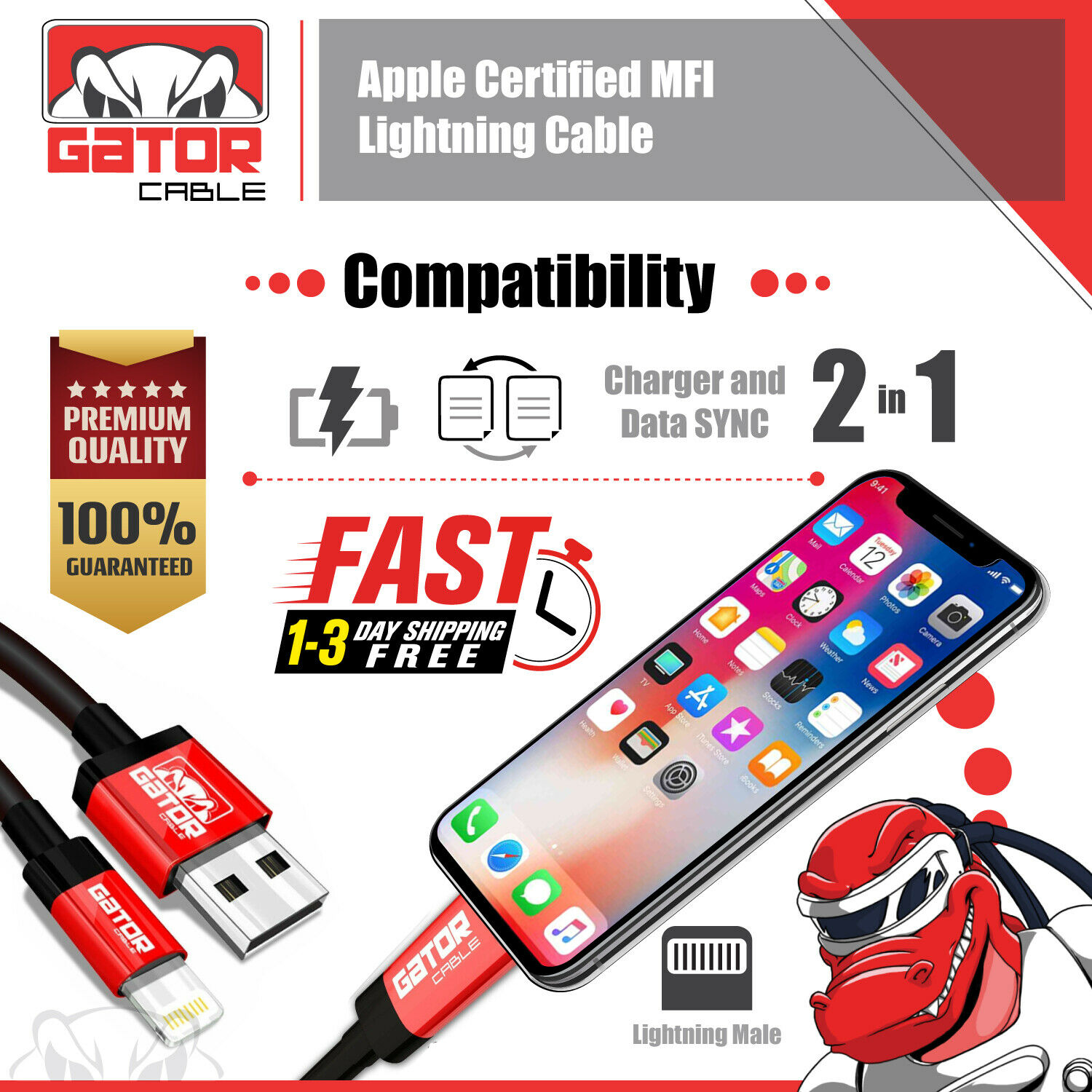 Gator Cable: Apple Certified MFI Lightning Cable Lengths: 3FT 6FT 10FT Charges and Syncs all Apple products and devices with 8-pin connector. Applications and Compatibility: iPhone 5 5S 5C iPhone 6 6S 6+ 6S Plus iPhone 7 7+ Plus iPhone 8 8+ Plus iPhone X iPhone XR iPhone XS iPhone XS Max iPhone 11 iPhone 11 Pro iPhone 11 Pro Max iPhone 12 iPhone 12 Pro iPhone 12 Pro Max iPhone 12 Mini iPhone SE (2021 new version) iPad 1 2 3 4 iPad Mini 1 2 3 4 iPad Air Air 2 iPad Pro iPod Apple Certified MFI Lightning Cable Specifications: 3FT 6FT 10FT Length (Your Choice) 8 Pin Connector Maximum Data Transfer Rate: 5.0 Gbps Black Color PVC Molding Type Optimum Aluminum Alloy Shell (Not Low Cost Plastic) Data Line 28 AWG, Power Line 24 AWG Gold/Silver Plated Connectors USB 2.0 and backwards compatible 2.4A Rapid Charging Supports all Apple Lightning Devices We Offer The Lowest Prices On eBay for OPTIMUM Quality Cables + Free Shipping On All USA Orders! BUY 4 OR MORE GATOR CABLES GET FREE U.S. PRIORITY MAIL SHIPPING ALL ORDERS ARE SHIPPED OUT WITHIN 1 TO 10 HOURS! Ultra Fast - FREE Shipping Worldwide Shipping From USA to All USA International Shipping No Waiting 3 to 4 Weeks METALLIC CASING Strong-Rugged-Durable Heavy Duty Cables Premium Quality Cables! Apple Certified MFI Lightning Cable Ultimate Performance! Great Value! CLICK ON OUR eBay STORE