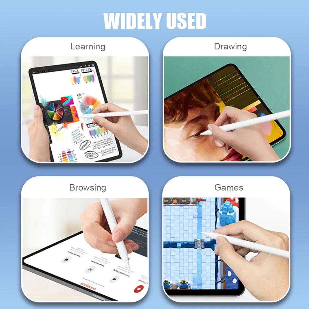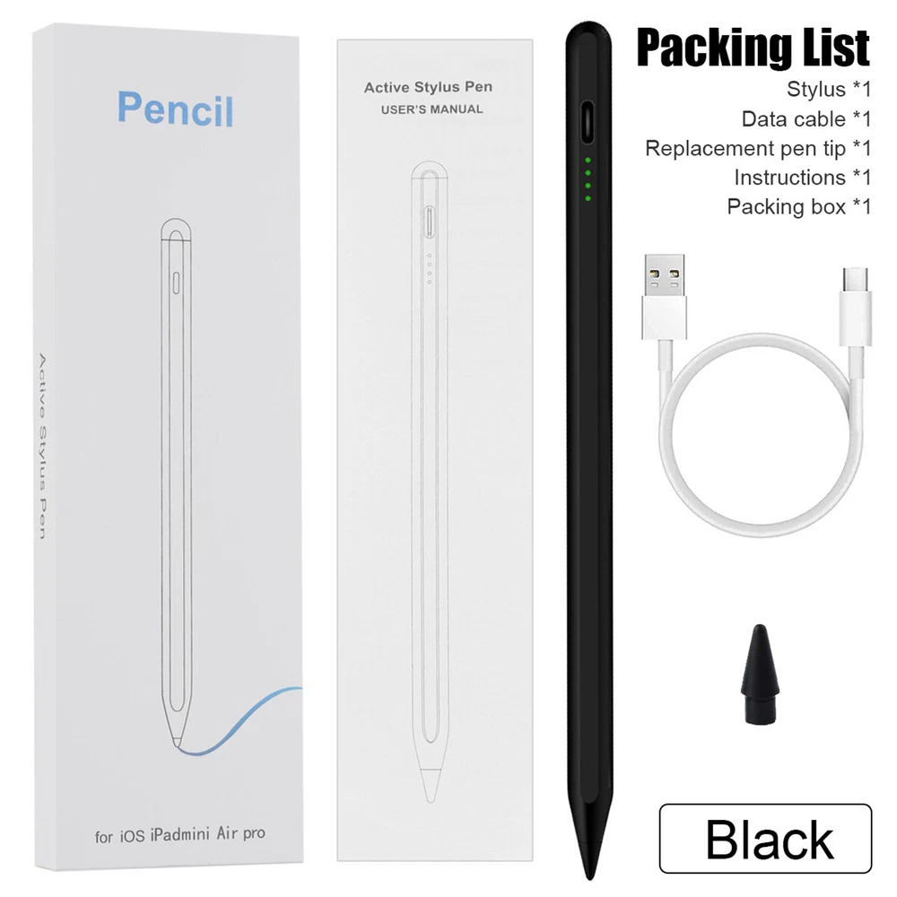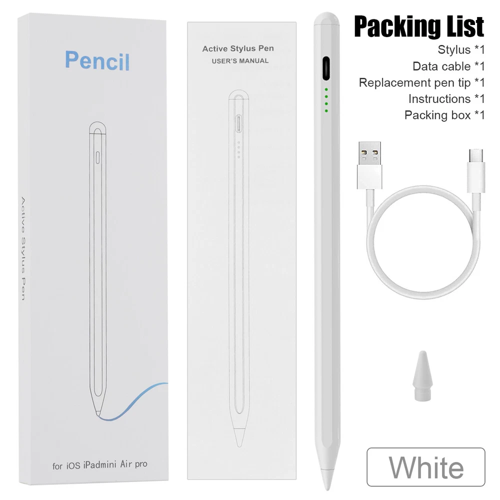eBay eBay Product Description Description: If you are someone curious about or in need of a stylus pen for drawing, writing, or note-taking, this is an excellent value at its price. This stylus pen with lndicator light and smart touch switch, can be rechargeable by Type-C cable.Our Pencil comes with 1 durable and usable, removable & replaceable pentips which made of high quality POM materials,friendly to your iPad screen and easier to replace. No scratching the screen, no lag, no skipping, and more freedom and naturally to write and working.Take it as the gift to your love, family members.It won't let you down. Feature: 【 Compatible with iPad Models 】 This stylus pen compatible with 2018-2022 iPad & iPad Pro. Such as for iPad Pro 6th/5th/4th/3rd,iPad Air 5th/4th/3rd,iPad 10th/9th/8th/7th/6th,iPad Mini 5th/6th.Not compatible with 2017 and earlier Apple iPad, and also does not support for Android, Microsoft devices. Please confirm whether your model is compatible before buying. 【 Smart Touch Operation & Extra Long Standby 】 No Need Bluetooth or any Apps.Double touches on the top to start or stop the stylus pencil.Built-in 1 00mAh, battery provides 8 hours active use and long standby time, for only 20 minute charging by a USB-C cable. 【 Stylus Pen With Palm Rejection 】 You can rest your palm comfortably on the screen when writing or drawing by the upgraded active pencil with palm rejection. No need to wear gloves. This technology provids you with a more smoother,naturaller writing/drawing experience. 【 Magnetically Attach 】 This rechargeable stylus pen can be attached to the side of iPad by the powerful magnetic, but does not support magnetic charging. More portable, easier to organize,No more rolling and lost. 【 Perfect Precision 】 This Stylus Pen for iPad has an ultra-fine 1.5mm tip which allows precise strokes and easier to write small characters. No scratching the screen, no lag, no skipping. Not easy to break! Compatible Models: Stylus Pen Compatible with apple iPad (6th,7th,8th,9th,10th generations) It compatible with iPad 10th (10.2-inch) A2696/A2757/A2777 It compatible with iPad 9th (10.2-inch) A2602/A2604/2603/2605 It compatible with iPad 8th(10.2-inch) A2270/A2428/A2429/A2430 It compatible with iPad 7th(10.2-inch) A2197/A2198/A2200 It compatible with iPad 6th (9.7-inch) A1893/A1954 It compatible with iPad Pro 3 (11-inch ) A1980/A2013/A1934/A1979 It compatible with iPad Pro 3 (11-inch ) A2228/A2068/A2030/A2231 It compatible with iPad Pro 3 (11-inch ) A2377/A2459/A2301/A2460 It compatible with iPad Pro 3rd (12.9-inch) A1876/A2014/A1895/A1983 It compatible with iPad Pro 4th (12.9-inch) A2229/A2233/A2069/A2232 It compatible with iPad Pro 5th (12.9-inch) A2378/A2461/A2379/A2462 It compatible with iPad Mini 5th (7.9-inch ) A2133/A2124/A2126/A2125 It compatible with iPad Mini 6th (8.3-inch) A2567/2568/2569 It compatible with iPad Air 3rd (10.5-inch) A2152/A2123/A2153/A2154 It compatible with ipad Air 4th (10.9-inch) A2316/A2324/A2325/A2072 NOTE: If your iPad Bluetooth connection uses the Apple Pencil, please clear the Apple Pencil from the Bluetooth list and turn off the Bluetooth function. This will prevent the stylus from being used with the iPad. Specification: Material: Aluminum Alloy Color:White Pencil Diameter Size: 9mm Pencil Nib Size:1.5mm Pencil Length: about 16.5cm/6.5" Charging Port:USB-C Battery Capacity:140mah Charging time: 20-30 minutes Charging head use: 5V 1A or 5V 2A (Do not use high power fast charger, will burn out) Continuous Working Time: 4-8 hours Compatible with most notes & drawing software in the APP Store. Indicator light introduction: When charging: display the current power level and blinking Fully charged: all four lights on When working: green light and display the current battery level Power saving mode: 30 minutes without use automatically switch off Package Included: 1* Stylus Pen 1* Replacement Tips 1* USB C Charging Cable 1* User's manual 1* Storage Box