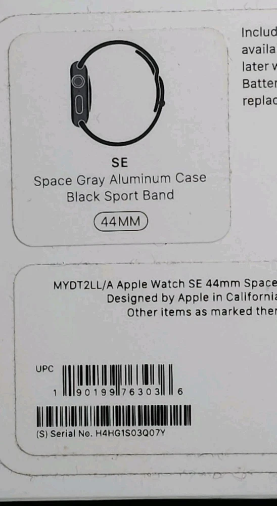 Apple Watch SE 44mm Space Gray Aluminum Case with Black Sport & Leather Band Detailed Specs Below This watch was rarely ever used and works perfectly. I purchased an extra (genuine) leather band and only wore it a couple times. The same can be said with the original black sports Band. All original paperwork, box, and charging cable are included. Feel free to ask if you have any additional questions, require additional photos, or additional information. Cheers, Johann Please Ask Questions if there any concerns. I am always open to discussion on any item. If you win/buy, Feedback is an important part of the Ebay experience. My goal is a satisfied customer, positive feedback and a five star experience. Please let me know if you are not satisfied before leaving negative feedback, I'm sure we can work it out. Apple Watch MYDT2LL/A Specs Product information Item details Brand Apple Model Name watch se Target Audience Unisex Adult Model Number MYDT2LL/A UPC 190199763036 Manufacturer Apple ASIN B08J5XTRZD Battery Battery Cell Type Lithium Ion Battery Average Life 18 Hours Battery Power 18 Style Shape Apple Color Space Gray Aluminium Case with Black Sport Band Compatibility Compatible Devices iPhone 6s or later with iOS 14 or later Additional details Additional Features Activity Tracker, Heart Rate Monitor GPS Geotagging Functionality True Case Material Type Aluminum Water Resistance Level Water Resistant Sport Type Walking, Cycling, Running, Swimming, Yoga, Fitness Human-Interface Input Buttons Supported Application GPS Memory & Storage Memory Storage Capacity 32 GB Connectivity Connectivity Technology Bluetooth, Wi-Fi, NFC, GPS Wireless Compability Bluetooth, 802.11bgn, 2.4 GHz Radio Frequency Display Screen Size 44 Millimeters Measurements Item Dimensions 10.47 x 2.99 x 1.36 inches