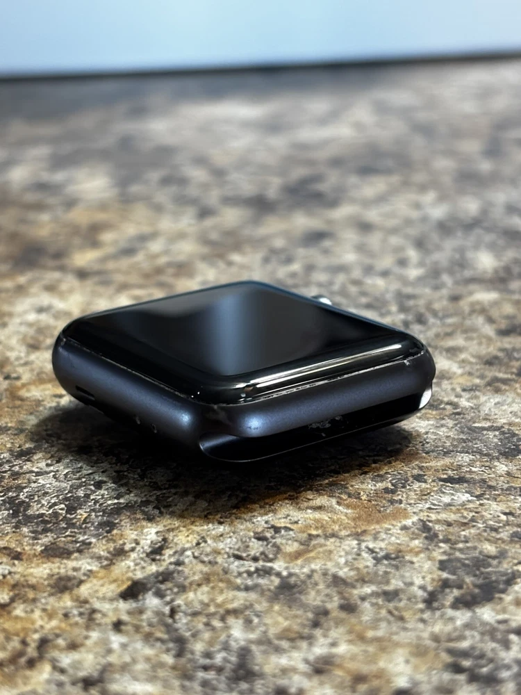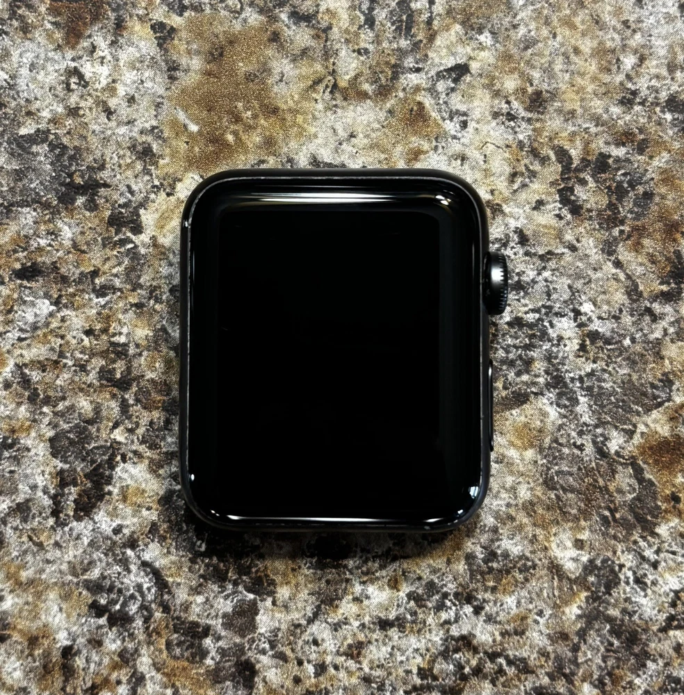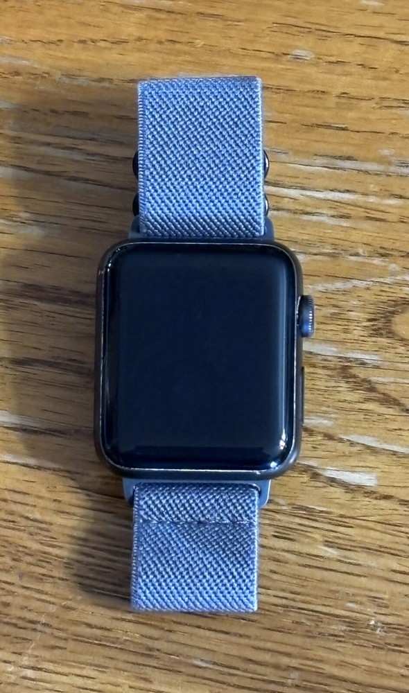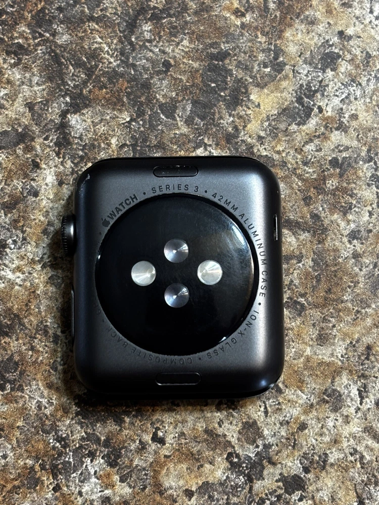 Apple Watch Series 3 42mm. Model MTF32LL/A space grey (GPS). Shows wear so please view photos for condition. Tested, works, and is reset for new user. Comes with original box and brand new, stretchy grey band. Smoke-free home. Sells as-is with no returns.