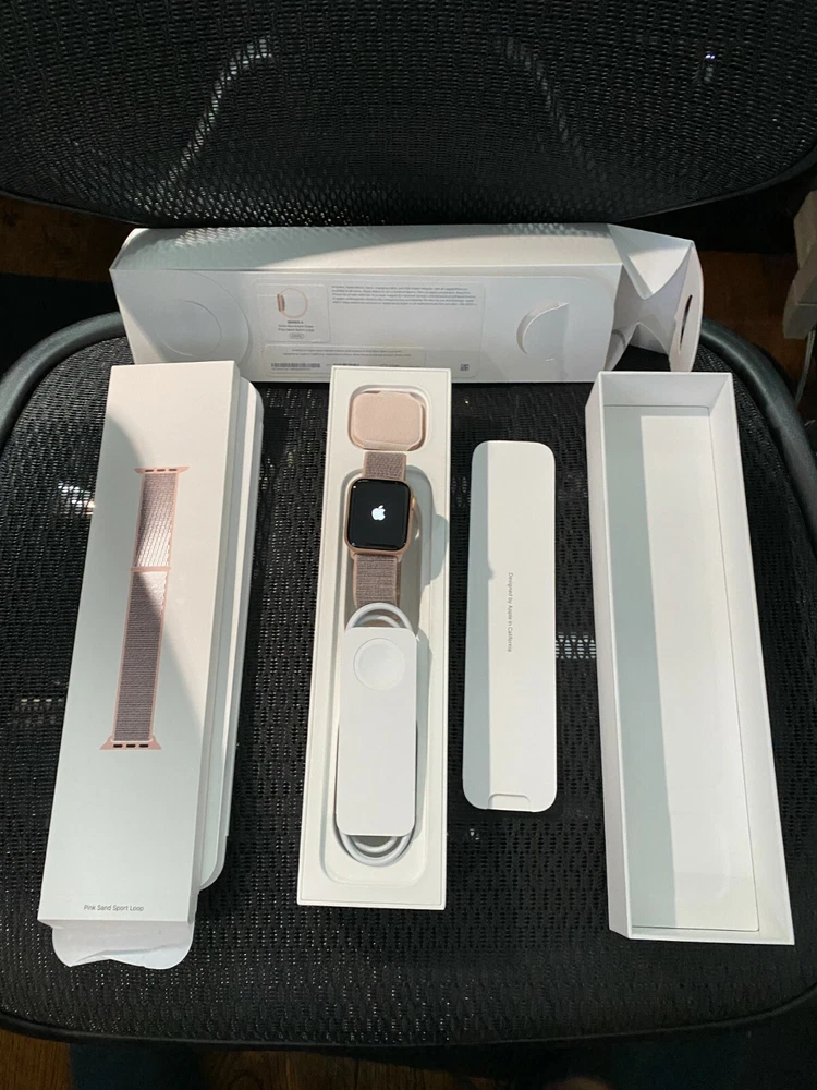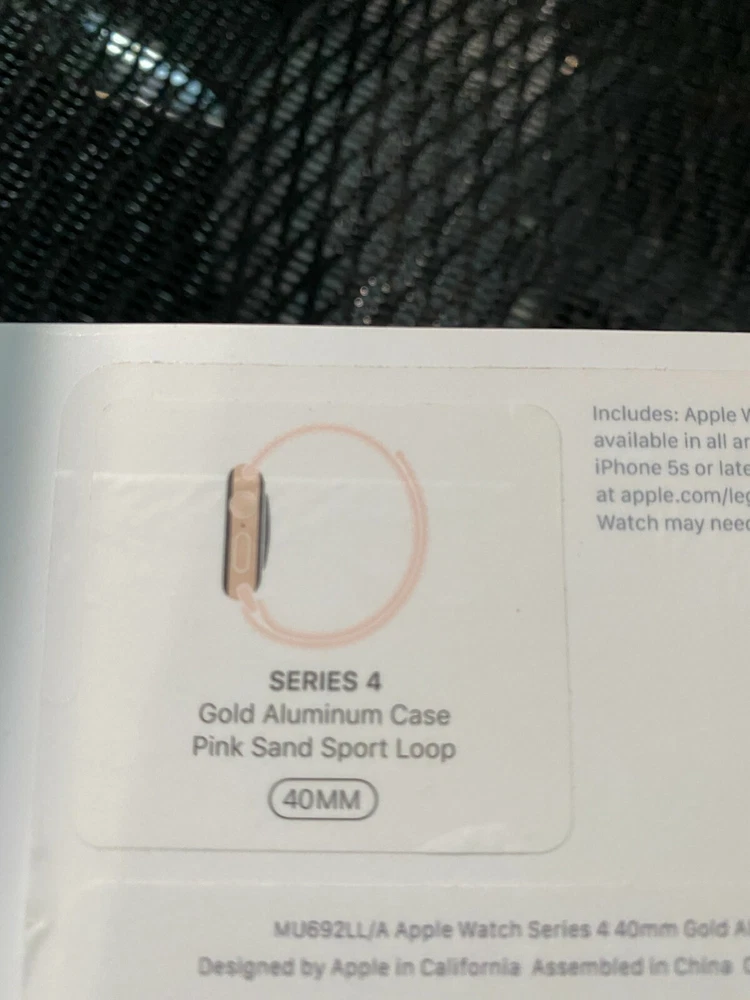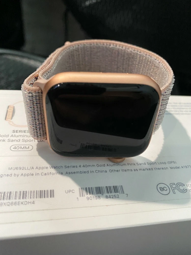 Apple Watch Series 4 (GPS) 40mm Gold Aluminum Case with Pink Sand Sport Loop - Gold Aluminum Description Fundamentally redesigned and reengineered. The largest Apple Watch display yet. Built-in electrical heart sensor. New Digital Crown with haptic feedback. Low and high heart rate notifications. Fall detection and Emergency SOS. New Breathe watch faces. Automatic workout detection. New yoga and hiking workouts. Advanced features for runners like cadence and pace alerts. New head-to-head competitions. Activity sharing with friends. Personalized coaching. Monthly challenges and achievement awards. You can use Walkie-Talkie, make phone calls, and send messages. Listen to Apple Music¹ and Apple Podcasts. And use Siri in all-new ways. Apple Watch Series 4 lets you do it all right from your wrist. Features GPS Over 30% larger display² Electrical and optical heart sensors Digital Crown with haptic feedback 50% louder speaker² S4 SiP with faster 64-bit dual-core processor Improved accelerometer and gyroscope for fall detection Swimproof³ watchOS 5 Aluminum case Selection may vary; see a sales associate for available models. Apple Watch Series 4 (GPS) requires an iPhone 5s or later with iOS 12 or later. ¹Apple Music requires a subscription. ²Compared with the previous generation.