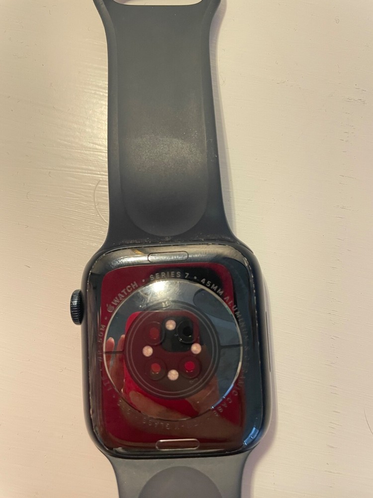 Apple Watch Series 7 in 45mm Aluminum Case with Sport Band in Midnight black. Features include Blood Oxygen Sensor, ECG Monitor, GPS, and Heart Rate Monitor. With 32GB storage capacity and compatibility with iOS devices, this smartwatch also offers an altimeter and fall detection. Perfect for fitness tracking and staying connected on the go. Selling simply because I do not use it. In perfect condition. Only used for 6 months.