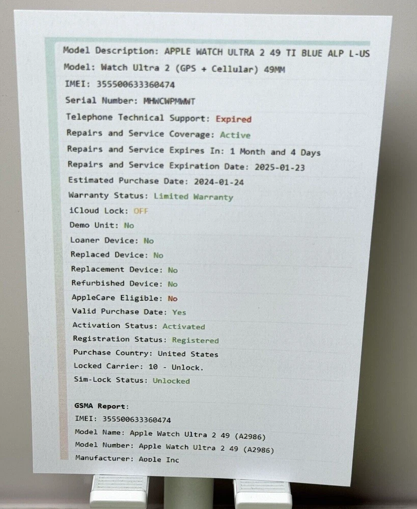 The watch is in good condition. No scratches on the screen, only minor marks on the bezel and case. The band shows visible wear and color fading. Comes with original charger and nothing else. Everything works well. Model Description: APPLE WATCH ULTRA 2 49 TI BLUE ALP L-USA Model: Watch Ultra 2 (GPS + Cellular) 49MM IMEI: 355500633360474 Serial Number: MHWCWPMWWT