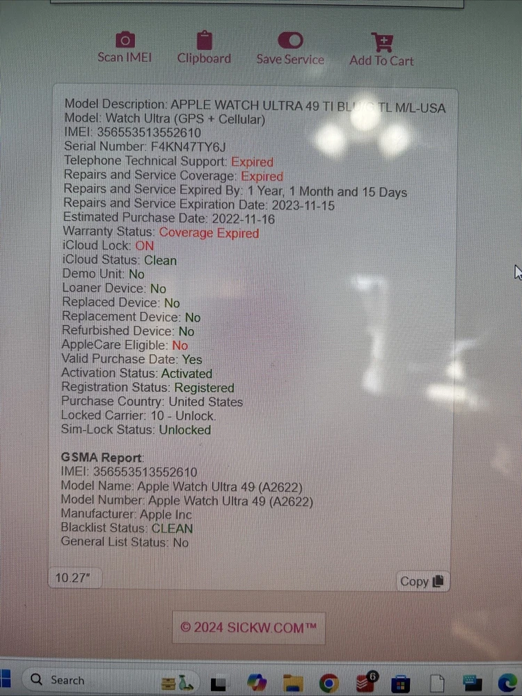 IMEI is in photos This device is unlocked iCloud has been removed and set to factory. Included in sale: device and watch band (pictured attached) only. Condition: all security features work. Speaker works. All buttons work. Screen has no scratches. Sides and corners has light ware with light scratches. Back has no scratches. Please refer to photos for additional information. Disclaimer: please check with your carrier to make sure this device will work. Some devices that are financed from the previous owner can only be used on that network and some not at all. We are not responsible for returns for a device that was purchased and will not operate on purchasers network. Please read item description thoroughly, as we are not responsible for an incorrect purchase.