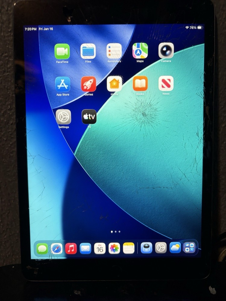 This is a listing for a iPad 9th Generation, 64GB, Wifi only, Space Gray. The screen is shattered and has cracked holes, back of the iPad is scratches up and has dents as well and when tested, it overheats, battery health is unknown. This is a Wifi only iPad which it cannot be used for carriers. It is a 64GB model and Touch ID works well as well, digitizer also works (touch screen). This is listed for parts due to the condition, please note this iPad is listed for parts for the condition it is in.