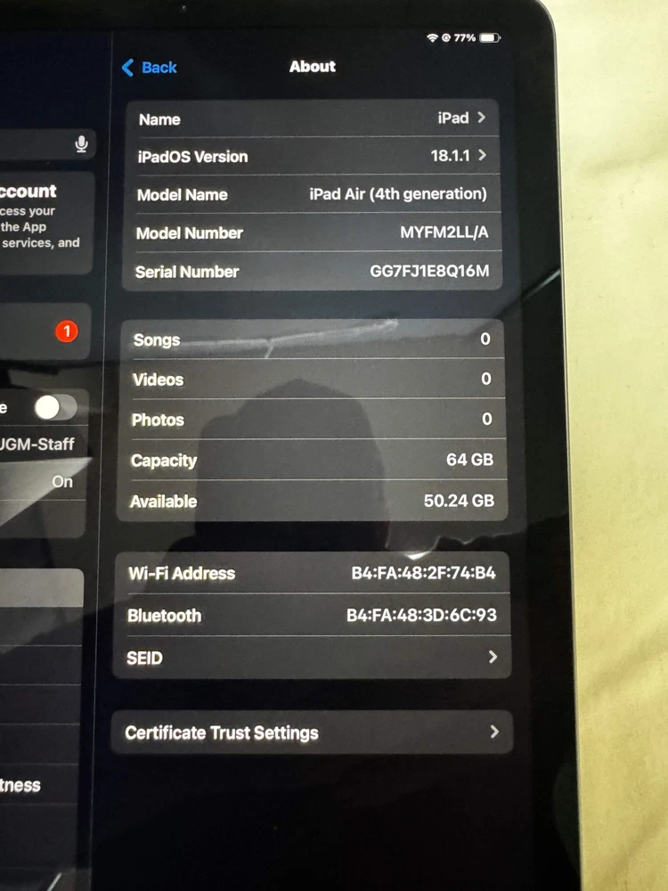 Apple iPad Air (4th Generation) A2316 64 GB, Wi-Fi, 10.9 in - Space Gray Disclaimer: This item is pre-owned and may show signs of wear and tear please refer to photos for more information. This item was tested functionality including powering on properly, displaying images, connecting Bluetooth devices, accessing the internet, No further testing was done. SOLD AS IS Experience the ultimate in productivity and portability with the Apple iPad Air (4th Generation). With its 64 GB storage capacity and Wi-Fi connectivity, you can easily store and access your files and stay connected on the go. The 10.9 inch display and sleek Space Gray design offer a stunning viewing experience and premium style. Upgrade your tech game today. Item#0040 Apple iPad Air (4th Generation) A2316 64 GB, Wi-Fi, 10.9 in - Space Gray Disclaimer: This item is pre-owned and may show signs of wear and tear please refer to photos for more information. This item was tested functionality including powering on properly, displaying images, connecting Bluetooth devices, accessing the internet, No further testing was done. SOLD AS IS Experience the ultimate in productivity and portability with the Apple iPad Air (4th Generation). With its 64 GB storage capacity and Wi-Fi connectivity, you can easily store and access your files and stay connected on the go. The 10.9 inch display and sleek Space Gray design offer a stunning viewing experience and premium style. Upgrade your tech game today. Item#0040 × × × × × × × × Buy now and save! Shipping info Click the Shipping & Payments tab above the listing description for more info FREE Shipping Click the Shipping & Payments tab above the listing description for more info! Additional delivery notes PICK UP OPTION Sorry, our items are NOT available for pick-up. PAYMENT Immediate payment is required upon selecting "Buy It Now" or upon checking out through the cart. We accept payment via U.S. PayPal accounts and all Major Credit Cards, Debit Cards & Google Pay. We are legally required to collect sales tax in those states and localities where we maintain a physical presence (nexus). The applicable amount of sales tax charged to an order will be calculated based on the shipment destination's state and local sales tax laws. Thank you for shopping with us on eBay! Additional Information No additional information at this time Ask seller a question You might also like AIWA HS-P05 Vintage Stereo Cassette Player (Untested) #0002 Blue Tees The Player Magnetic Speaker 2022 (Tested) #0003 Akai MPK Mini Compact Keyboard Controller (Tested) #0004 Vintage Black Sega Game Gear w/ Battery Bank & NBA Jam (Tested) #0005 Contact To contact our Customer Service Team, simply click the button here and our Customer Service team will be happy to assist. Ask seller a question © YUGM Thrift eShop Shipping & Payments Shipping is FREE for this item Payment Accepted Payment Methods Immediate payment is required upon selecting "Buy It Now" or upon checking out through the cart. We accept payment via U.S. PayPal accounts and all Major Credit Cards, Debit Cards & Google Pay. We are legally required to collect sales tax in those states and localities where we maintain a physical presence (nexus). The applicable amount of sales tax charged to an order will be calculated based on the shipment destination's state and local sales tax laws. Thank you for shopping with us on eBay! Returns Returns are accepted Items must be returned within 30 days of the auction ending Buyer will pay for return shipping. eBay integration by
