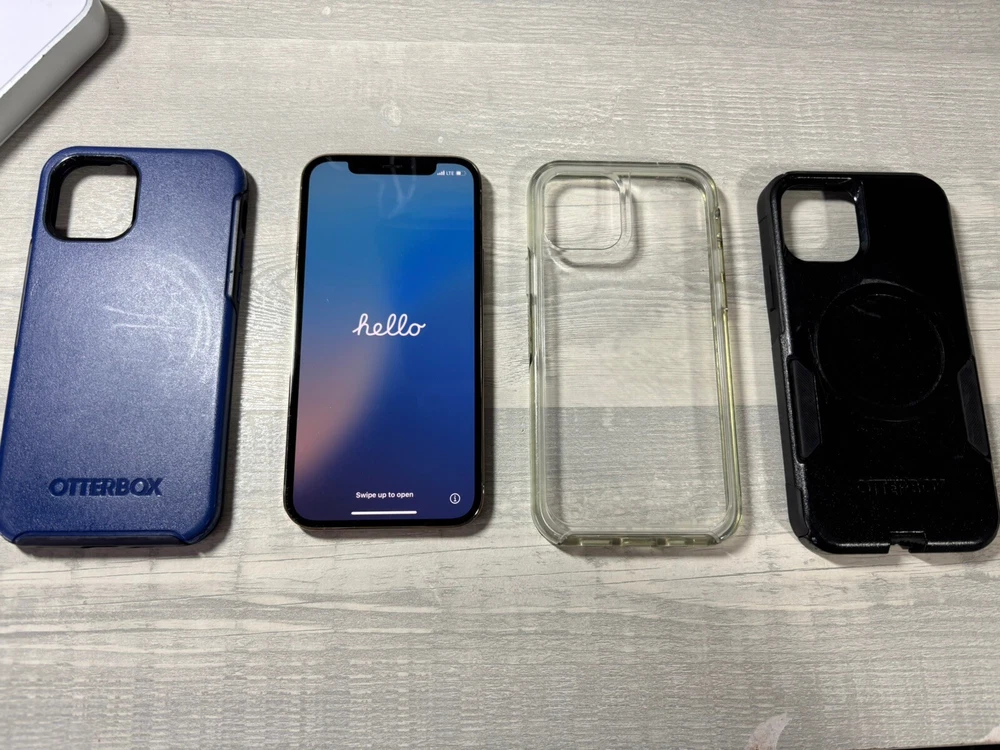 iPhone 12 Pro Battery Health 90% All OEM Parts Verizon Locked (but paid off) No iCloud lock Fully Reset With Find My Off All Features Work Gold 128GB Internal Storage Includes: iPhone 12 Pro Gold 128GB Verizon Locked 1 OtterBox Symmetry Clear 1 OtterBox Symmetry+ Navy Blue with MagSafe 1 OtterBox Commuter Black Case (All items included are used) This iPhone has been in a case for its whole life with me. The screen has moderate scratches that are kind of noticeable but will not be annoying. This phone is still very great in 2025 and updates for years to come. Shipping Service differs by location This item doesn't include a charger. Thanks for your interest and this item! You may send an offer! Please view all photos before buying and feel free to ask about any other details about the phone.