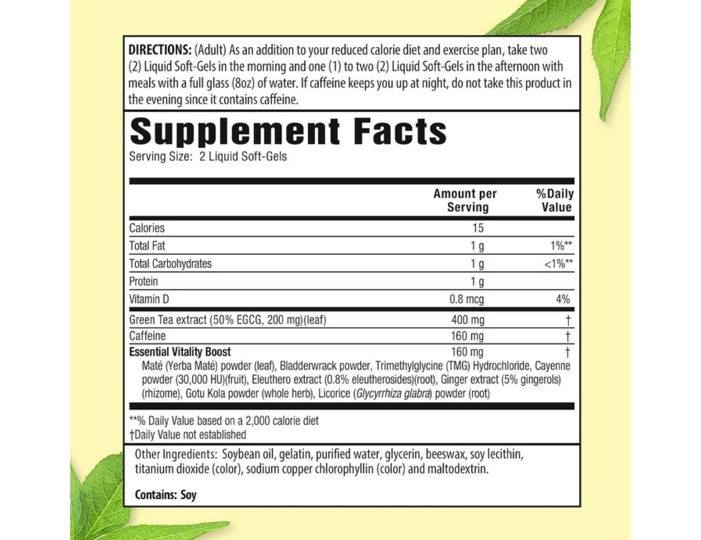 Product details Applied Nutrition Green Tea Fat Burner Liquid Softgels, 90 ct GREEN TEA FAT BURNER - Green Tea Fat Burner delivers a highly concentrated form of green tea extract combined with caffeine that has been shown to increase calorie burning, supply powerful antioxidant protection, and achieve weight loss goals. GREEN TEA EXTRACT - Traditionally used in China for thousands of years, green tea delivers a wide range of wellness-promoting nutrients. WEIGHT MANAGEMENT SUPPORT - This formula contains superior levels of EGCG, a powerful flavonoid found in green tea. When combined with caffeine, EGCG has been scientifically researched for its weight management support. ANTIOXIDANT BOOST - Nutrient-dense “super fruits” help protect against cell-damaging free radicals. This formula features grape skin, blueberry, bilberry, pomegranate, and elderberry. VITALITY BOOST - A blend of botanicals supplies phytonutrients that support antioxidant protection and wellness. Inactive Ingredients Soybean oil, gelatin, purified water, soy lecithin, glycerin, beeswax, titanium dioxide and sodium copper chlorophyllin. Ingredients Green Tea extract, Caffeine, Antioxidant Boost, Bilberry powder, Blueberry, European Elder, Grape Skin, Pomegranate Powder,Eleuthero Powder, Holy Basil, Schisandra, Asian Ginseng Active Ingredient Name Green Tea extract (50% EGCG)(leaf) 400 mg Caffeine 160 mg Antioxidant Boost 100 mg Bilberry powder (fruit), Blueberry (Vaccinium angustifolium) extract (4:1)(fruit), European Elder (Elderberry) powder (fruit), Grape Skin extract (5:1)(fruit), Pomegranate powder (fruit) Vitality Boost 86 mg Eleuthero powder (0.8% eleutherosides)(root), Holy Basil extract (2% ursolic acid)(herb), Mat? (Yerba Mat?) powder (leaf), Schisandra (Schisandra chinensis) powder (fruit), Asian Ginseng extract (80% ginsenosides)(root)