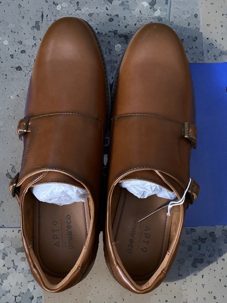 Retail: $50.00 Features memory foam PU upper and midsole PU material is (short for polyurethane, a flexible and and versatile plastic polymer) Fabric, PU lining Rubber outsole Plain toe Slip-on Foam footbed 1.1-in. heel For work, weekend, night out, featuring elevated fabrics grounded in comfort and ease. Refine your dress look with these Apt. 9 Howiee Men's Monk Strap Dress Shoes, featuring a sleek double-buckle design and polished faux leather finish. The cushioned insole and flexible outsole offer all-day comfort with a modern twist on a classic silhouette.
