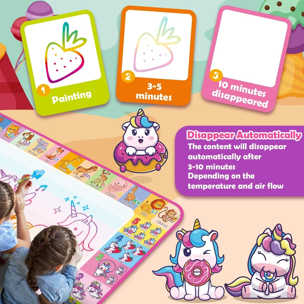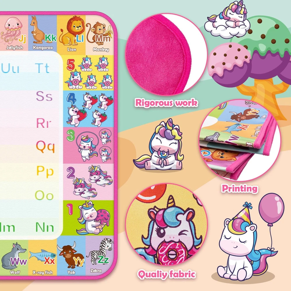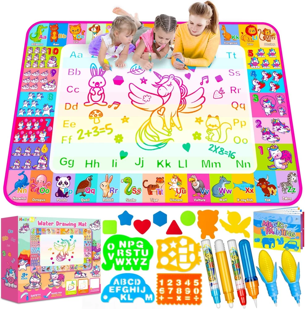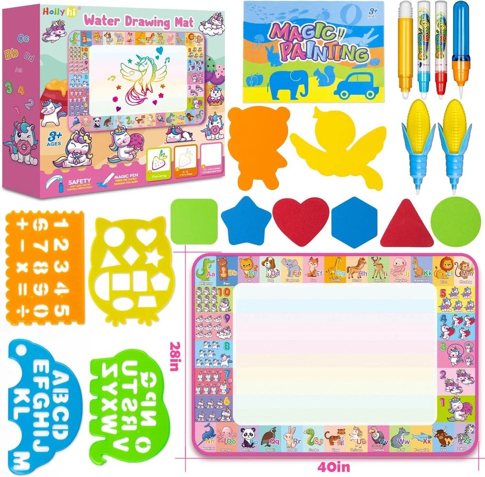Store New Arrivals Add to Favorite View Feedback Contact Aqua Water Doodle Mat - Kids Drawing Mat Toddlers Educational Toys for Age 3 4 5 6 7 8 Year Old Boys Girls Gifts - Neon Color Mat Doodle Board Writing Drawing Toys Holiday Christmas Birthday Gifts Description Item model number Q11 Number of Items 1 Mounting Type Floor Standing, Tabletop Mount Color Large/Pink Brand Hollyhi Material Polyester Material Type Polyester Manufacturer Part Number Q11 Item Weight 1 pounds Recommended Uses For Product Home Manufacturer Hollyhi Product Dimensions 28 x 28 x 40 inches Size 28"W x 40"H Toys for 3 4 5 6 7 8 Year Old Boys Girls【Large Size】—40 x 28 inch huge mat size, leaving more space for your kids' doodle art creation and sharing with friends. Teach kids how to draw different patterns with some molds, let them create their own world of art, broaden the child's imagination, and sparks the creativity of their infinite painting—wonderful educational gifts for boys girls toddlers. Water Drawing Mat【Reusable】—Great replacement for traditional painting paper, prevent colored pencil and crayon from marking all over the walls or furniture. Filling the magic pen with clean water and doodle on the drawing mat. It will magically disappear after 3-10 minutes (depends on temperature, airflow and how much water is on it). Kids can doodle on it time and time again. Alphabet patterns, which have neat-sized letters printed on the side, let your child start literacy while playing. Kids Toys Drawing Mat【Safety Material】—The painting pad is made of soft polyester material and the back pad is made of water-resistant canvas. The high-quality material does no needs extra cleaning and will also prevent you from the wet floor, which is no ink, no paint, no chemical smell, non-toxic,and best for kids drawing, painting and writing. Light and storage compatibility can be folded only take little space, is portable to carry anywhere. Suitable for indoor, outdoor and traveling. Communicating with children【Family Time】—This water painting mat can support a family drawing together on the floor to establish a more intimate parent-child relationship. At the same time, you can understand your children more through their imagination and creation. It's the best educational toy for expanding thinking and cultivating creativity, promoting early writing skills, and developing color and shape cognitive application—Great gifts for 3 4 5 6 7 8-year-old boys and girls and up. Package Include【Exquisite Gifts Packaging】—Water Magic Drawing Mat x 1, Different Magic Pens x 6, Colorful Drawing Mold x 6, Animal Drawing Mold x 2, Drawing Template x 4, Drawing Booklet x 1. Great for your kids' independent playing for hours. Stimulate children's creativity and imagination, develop hand-eye coordination and color perception, and develop painting and creative skills—the best choice for kids' Birthday, Christmas and reward gifts. Product Description Water Magic Mat Educational Toys for Infants and Young Children! This Water Drawing Mat allows kids to paint with friends, helps kids with color recognition and imagination development. Great replacement for traditional painting paper, prevent colored pencil and crayon from marking all over the walls or furniture. Filling the magic pen with clean water and doodle on the drawing mat.It will magically disappears after 3-10 minutes (depends on temperature, airflow and how much water on it), kids can doodle on it time and time again.Alphabet pattern, let your child start literacy while playing. Let Children Doodle and Play Happily at Water Magic Doodle Mat Simple to use --- Just add clean water, start doodle on the magic mat. Portable --- It can be folded into a compact size, easy to store. Educational Toy --- Practice children's drawing ability and stimulate their imagination. Color packing box---The best choice for kids Birthday or Christmas gifts. Safe & No Mess No mess for parents to have to clean up. Water magic drawing mat would definitely make a good present for boys and girls. Reusable Magic Mat After 3-10 minutes,the doodle on this magical pad magically disappears(depends on temperature, airflow and how much water on it). Easy to Storage A large, easy-to-store water doodle mat that only takes a minute to store after your kids play! Doodle by Oneself Kids can lie on the magical water canvas and play anywhere! Exercising Painting Booklet A coloring book which have variety of simple line pattern, exercise hand-eye coordination and development of painting skills. Learn Through Playing The water magic mat is printed with alphabet letter that can be copied and animal shape. Educational toys to allow kid learn more though play. Number & Alphabet Pattern Numbers, Letters, Animal, Unicorn supplies. This water drawing mat allows your kid to paint,Development of Language and cognitive skills. Great Exquisite Gifts A great doodle toys for those of you who have kids that love scribbling or drawing. Recommend boys and girls Ages 2 3 4 5 6 7 8 and up! 1 Easy to Use 2 Painting Time with Friend How do you erase the ink? This magic mat does not require you to do anything with the ink, it will disappear automatically after 3-10 minutes, great for your child to learn to draw and inspire creativity and innovation! Is the magic mat suitable for car travel? Very suitable. It's easy to store and lightweight to carry. The water that runs off the tool used to colour on the mat is almost non-existent, so there's no water floating around. What do you do if the product has bad smell? This product is 100% safe. Once this problem has been solved, open the package and store it in a dry, ventilated place for several days to remove the smell. What are you going to do if you find the missing parts? Please check the packaging to see if the packing box has been left out of the package. If you have any questions, please communicate with us, and we will offer you satisfactory service and solution. Does 