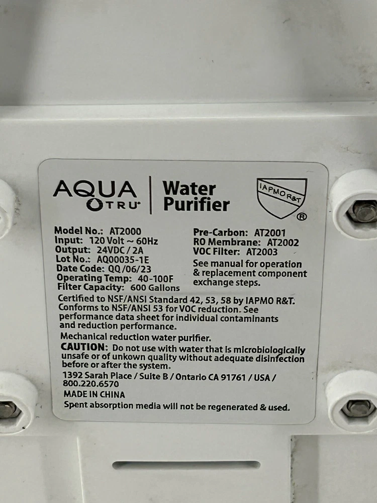Brand: AquaTru Capacity: 600 Gallons Filtration Method: Reverse Osmosis Suitable For: Household Country/Region of Manufacture: China Number of Filtration Stages: 4-Stages Compatible Model: Does Not Apply Color: White Model: at2000 Type: Countertop